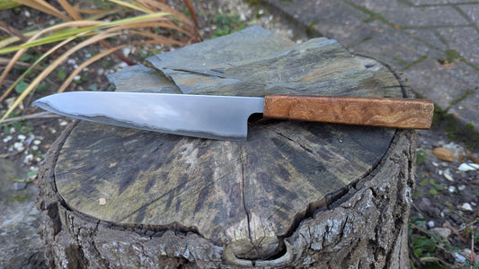 Hand made 6" Takefu super blue stainless clad San Mai. Lacewood burl handle