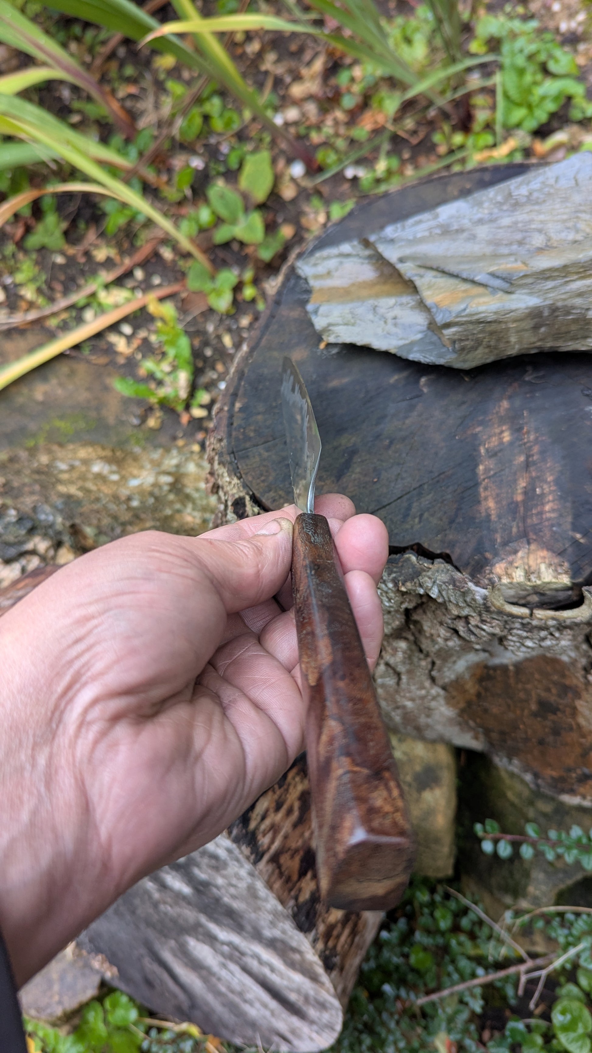 This knife is a compact all-rounder—light in hand yet with solid thickness behind the heel, giving it the strength needed for tougher tasks.
