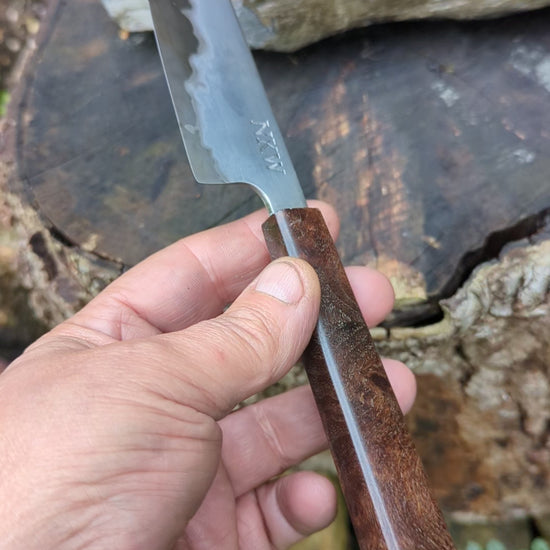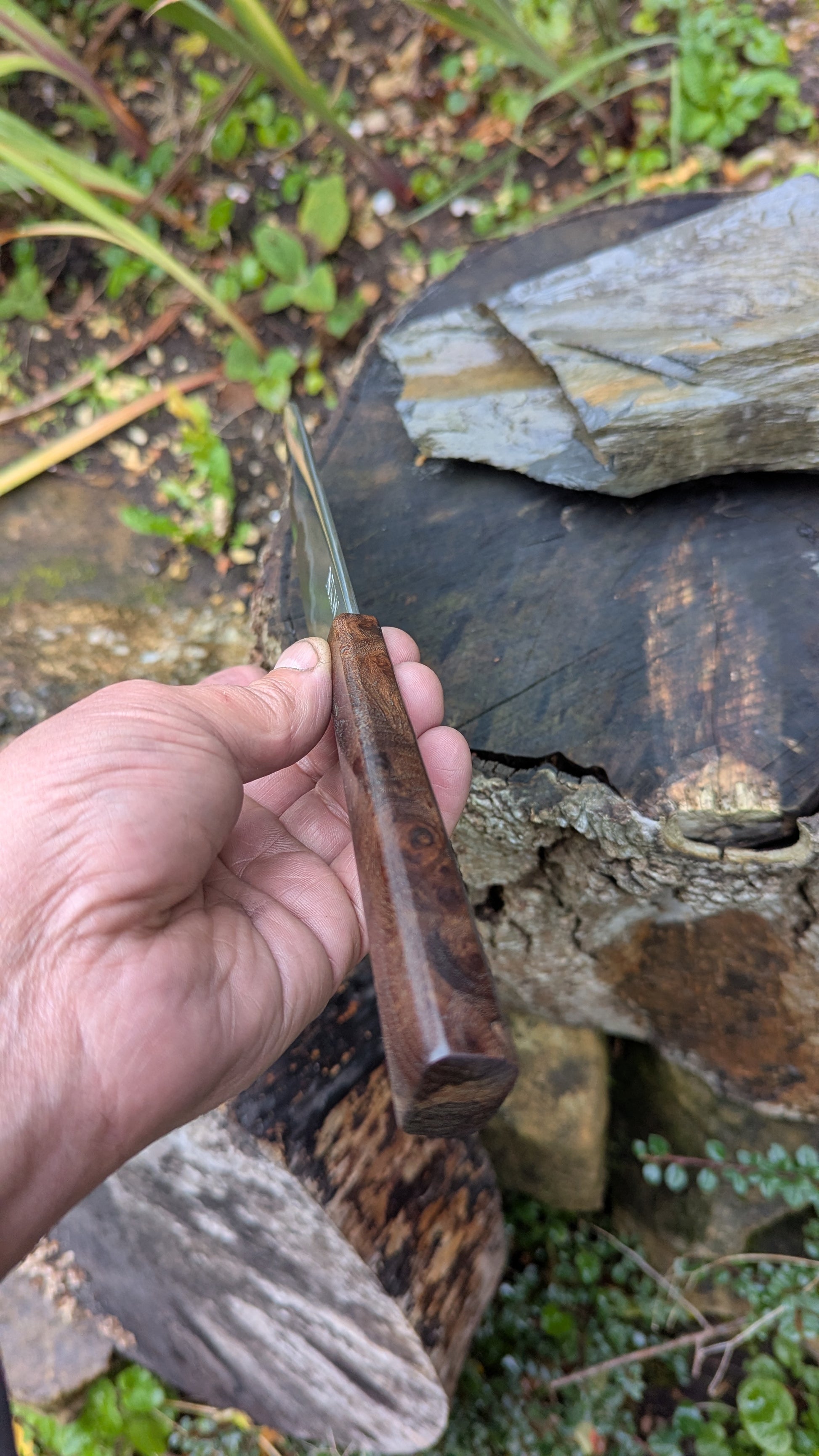 This 6″ knife is made with Takefu super blue stainless clad San Mai and a beautiful mystery wood burl handle