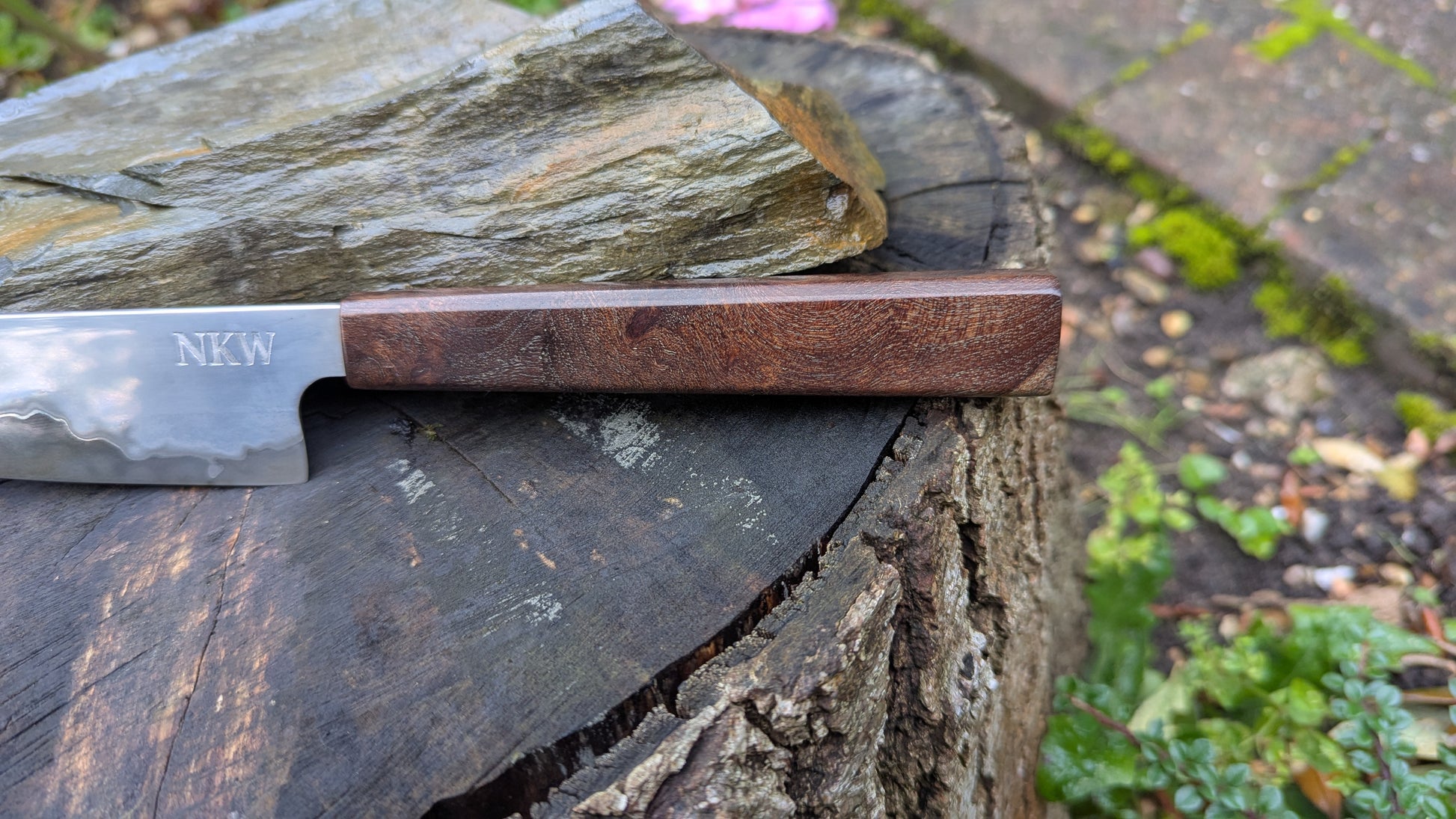 Steel: I forged this 3.5 mm Takefu Super Blue stainless-clad San Mai with a hand-textured finish. The convex grind enhances food release and cutting performance. Both steels have been given a forced patina to start the aging process and help you develop your own unique patina over time.