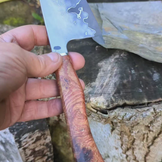 This 8″ knife is made with Takefu super blue stainless clad San Mai and a stunning piece of English Oak Burr for the handle.