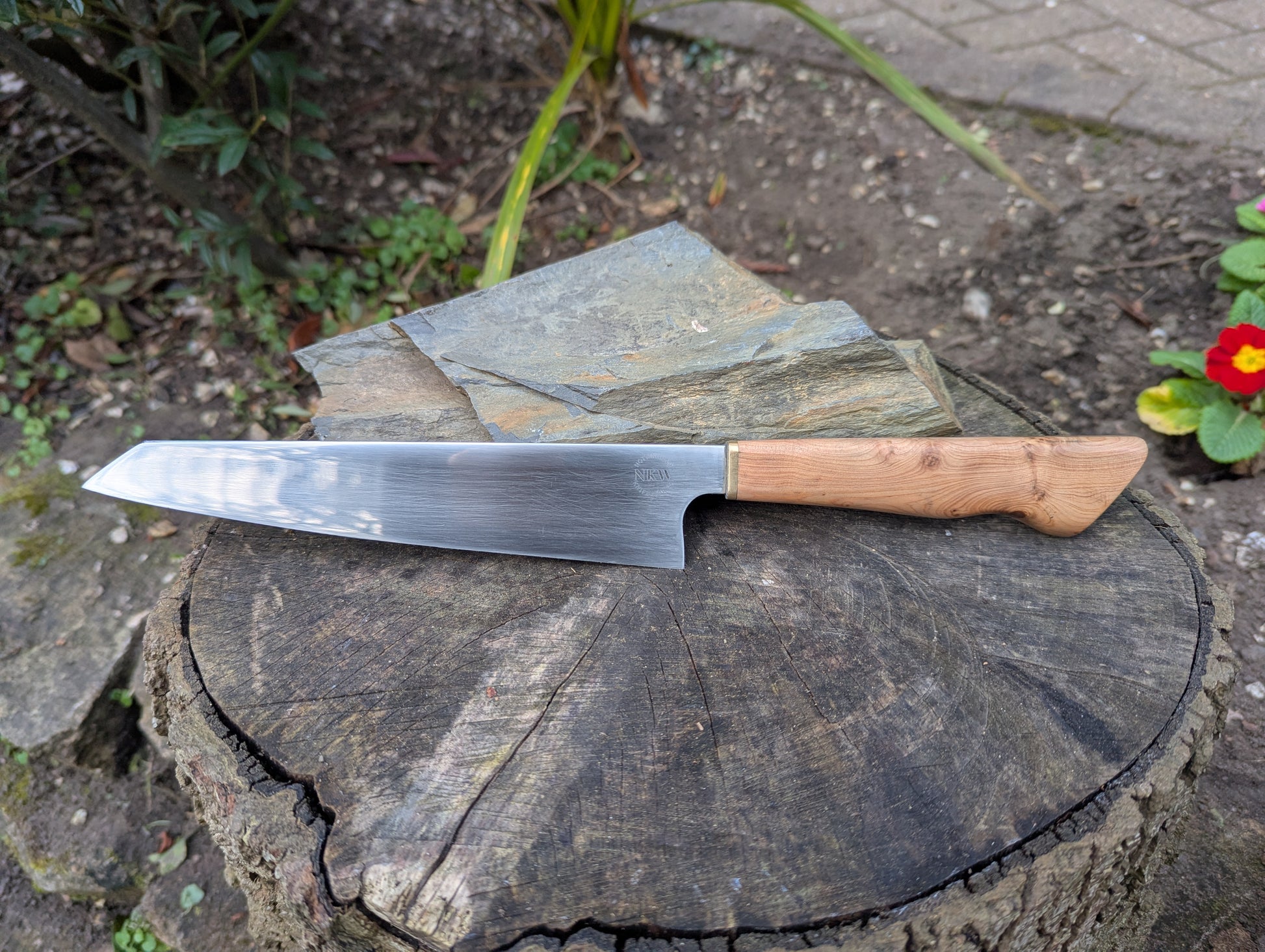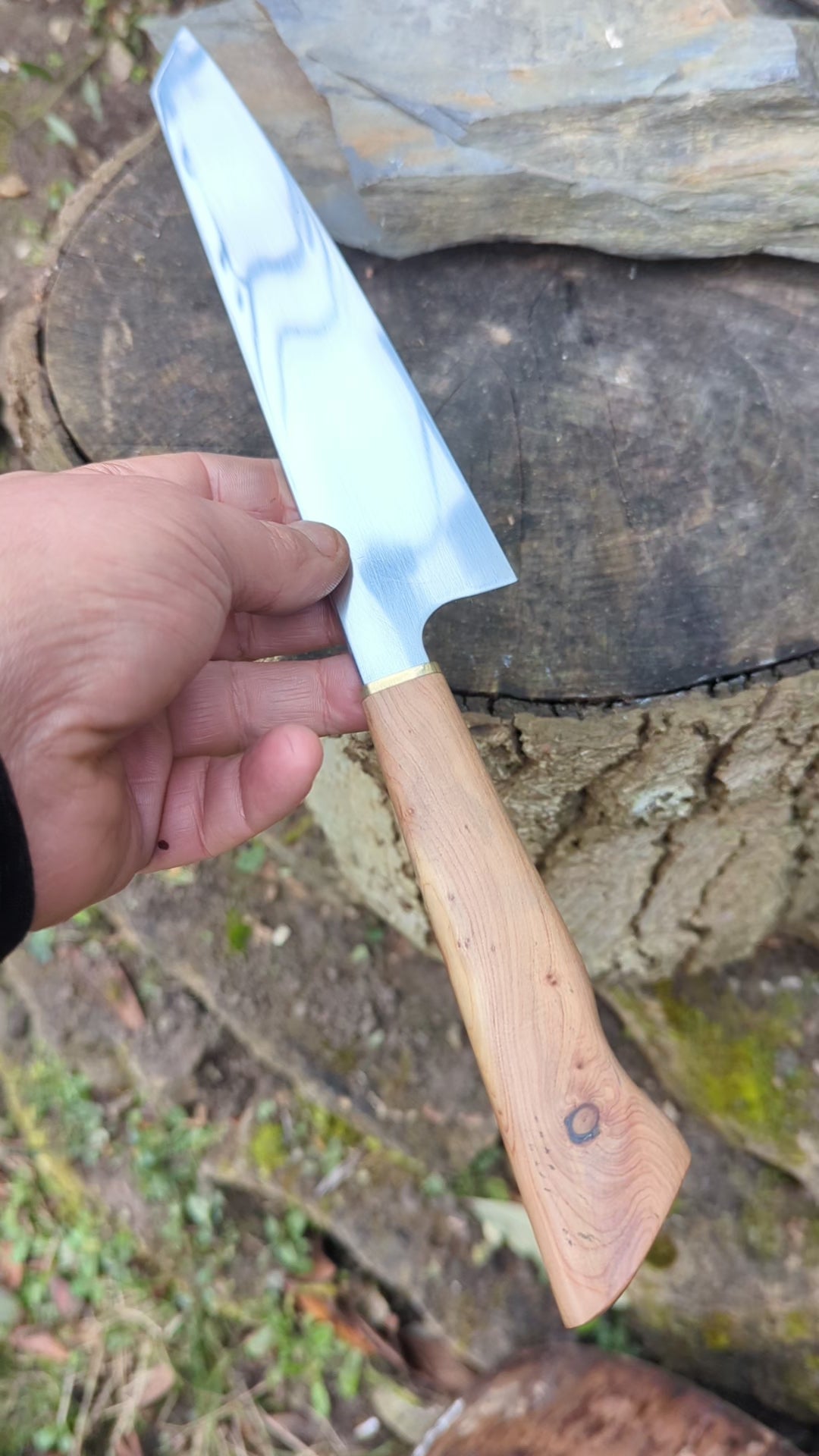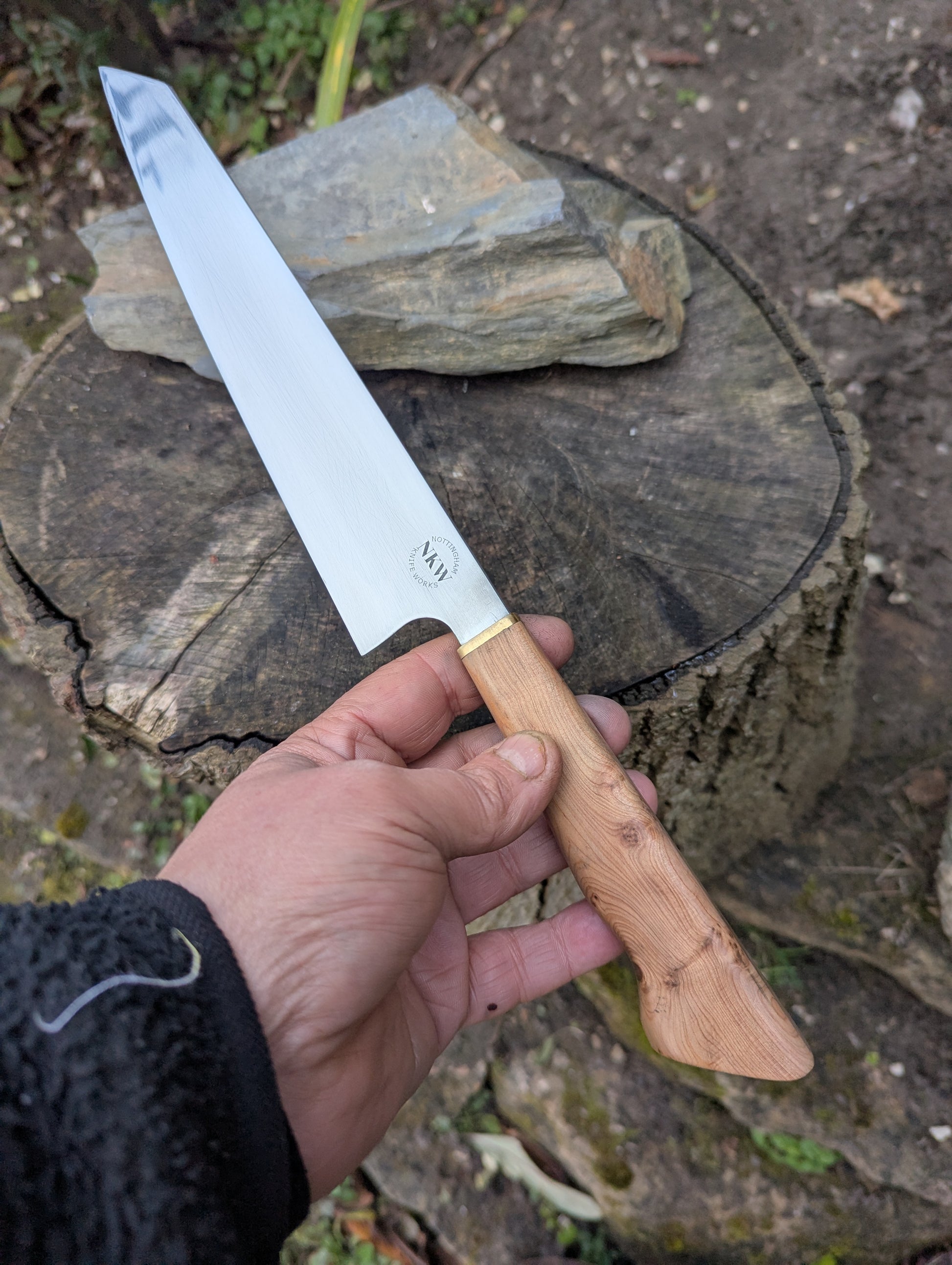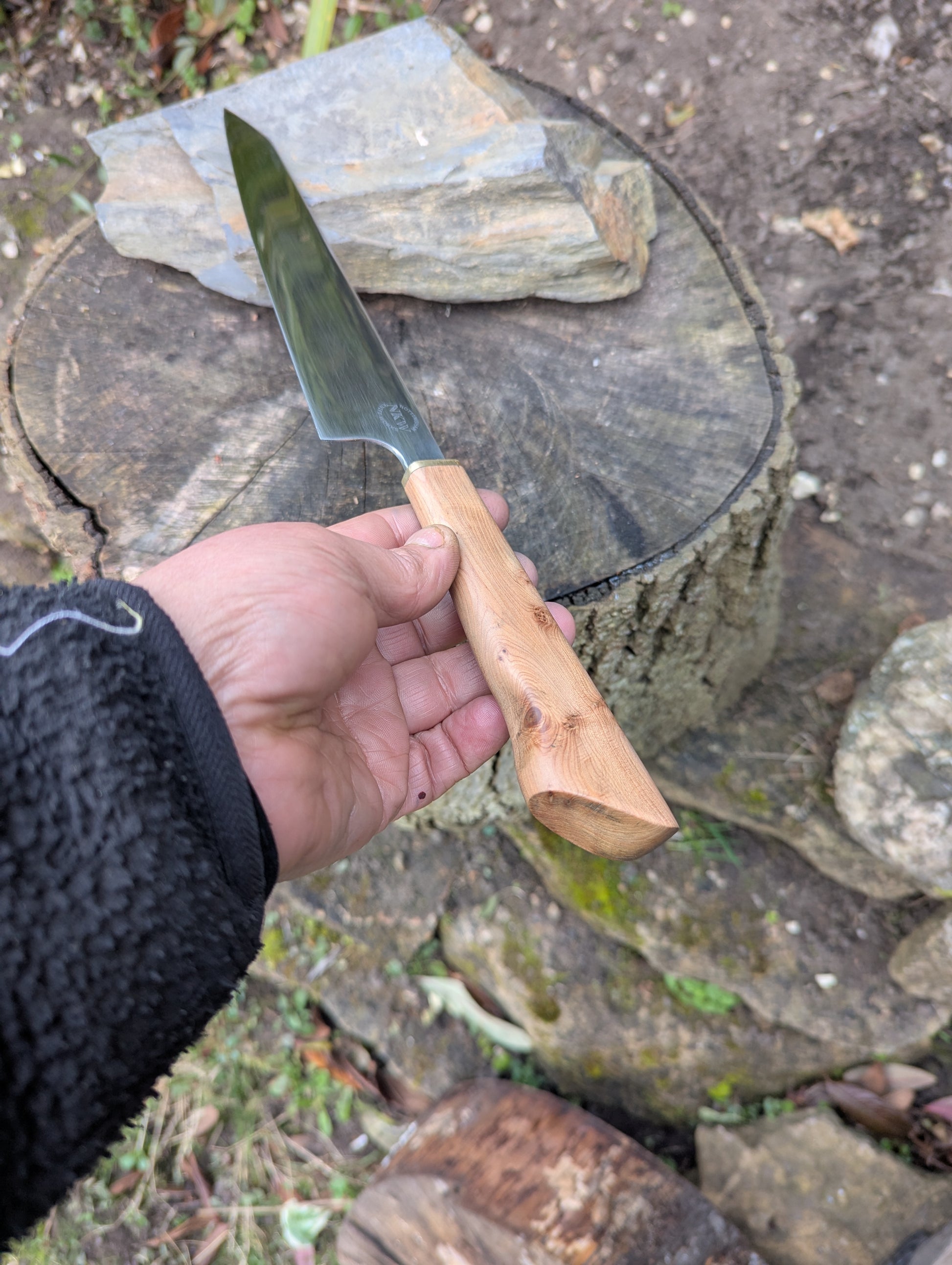 Handle: Fine and tapered Japanese style construction with Nickel silver bolster. Beautiful Cade/Juniper wood from the south of France and it smells amazing too.