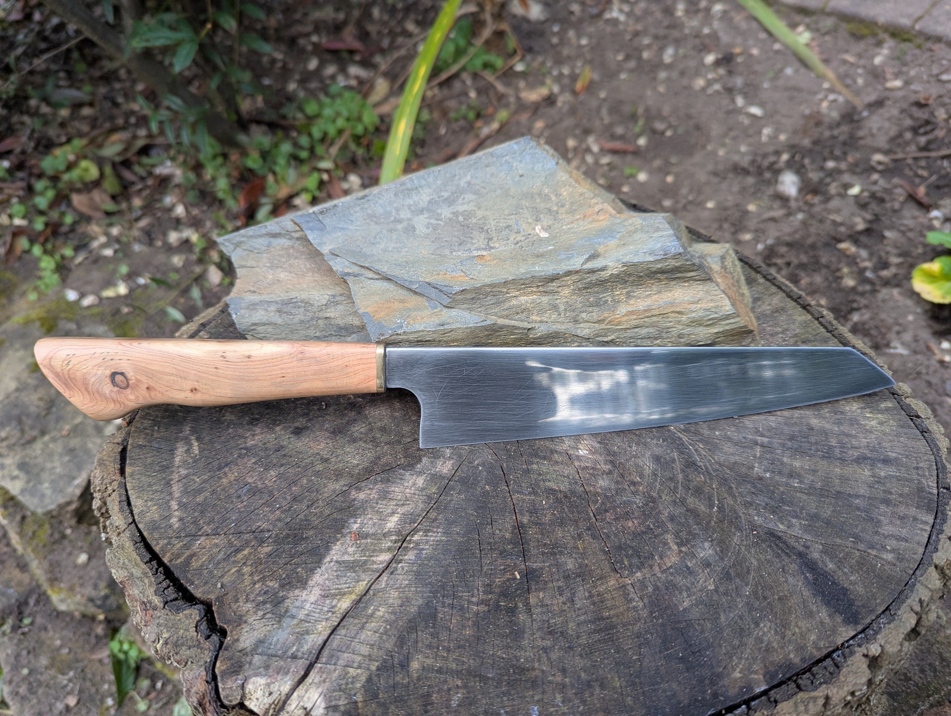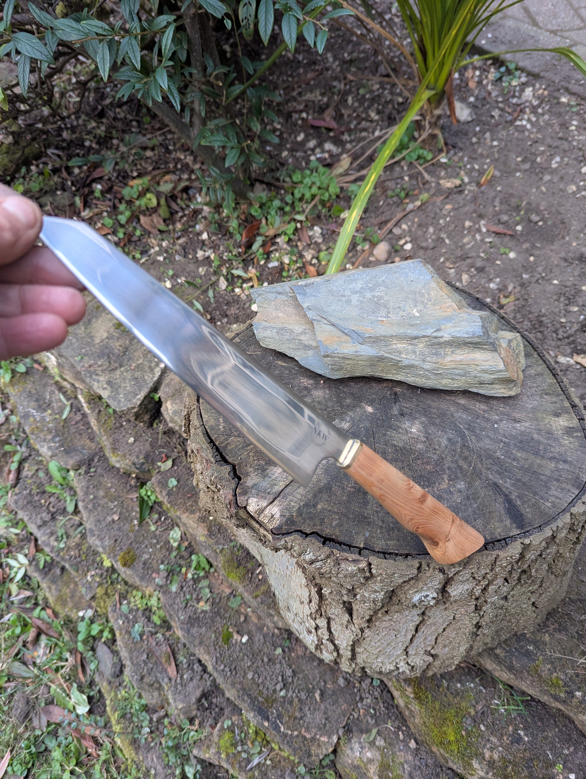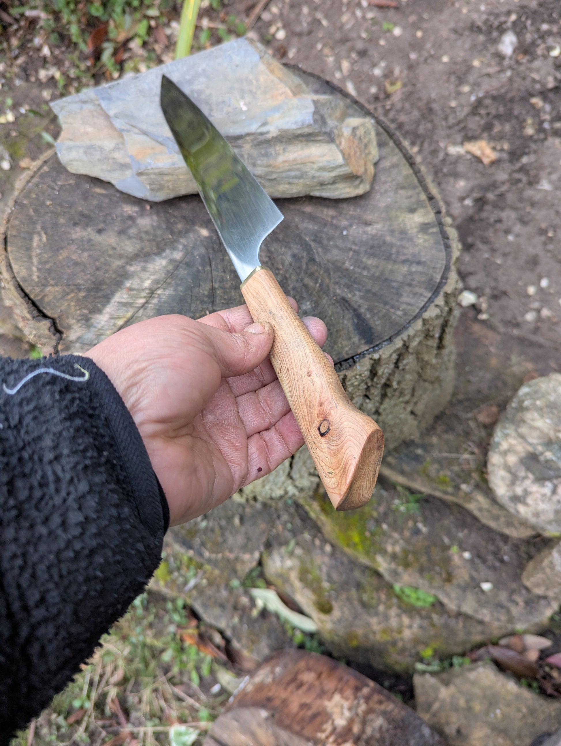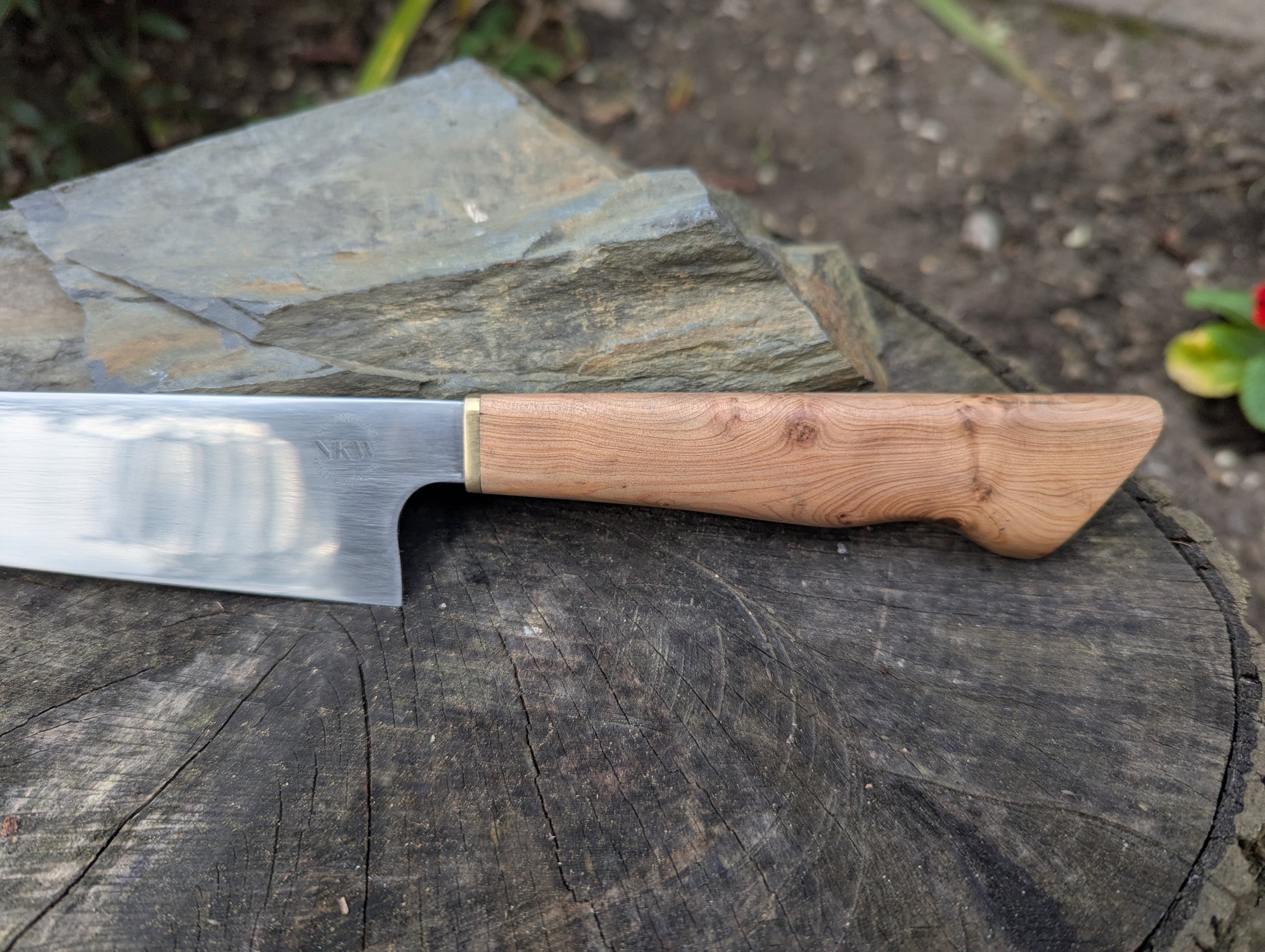 Handle: Fine and tapered Japanese style construction with Nickel silver bolster. Beautiful Cade/Juniper wood from the south of France and it smells amazing too.