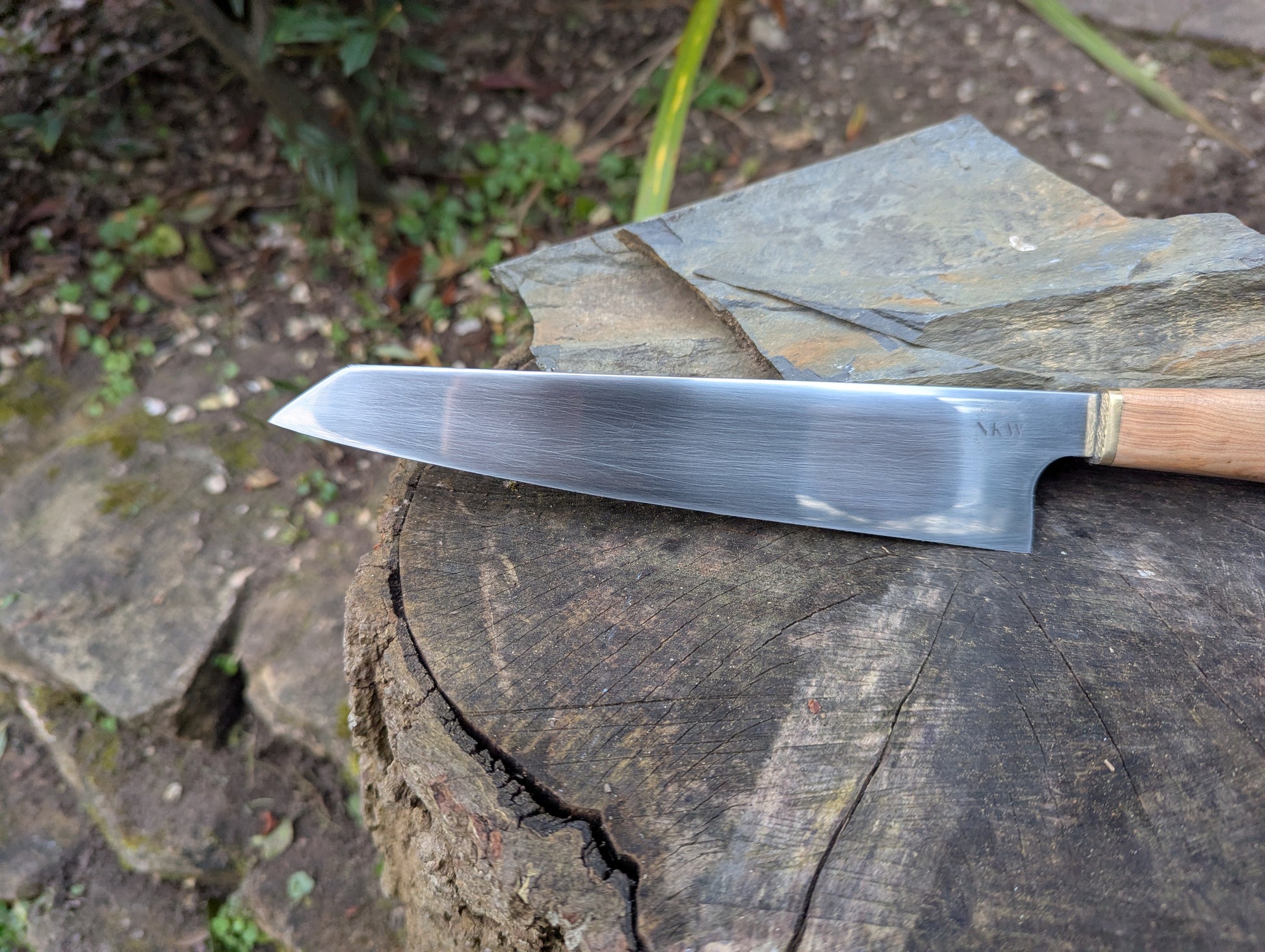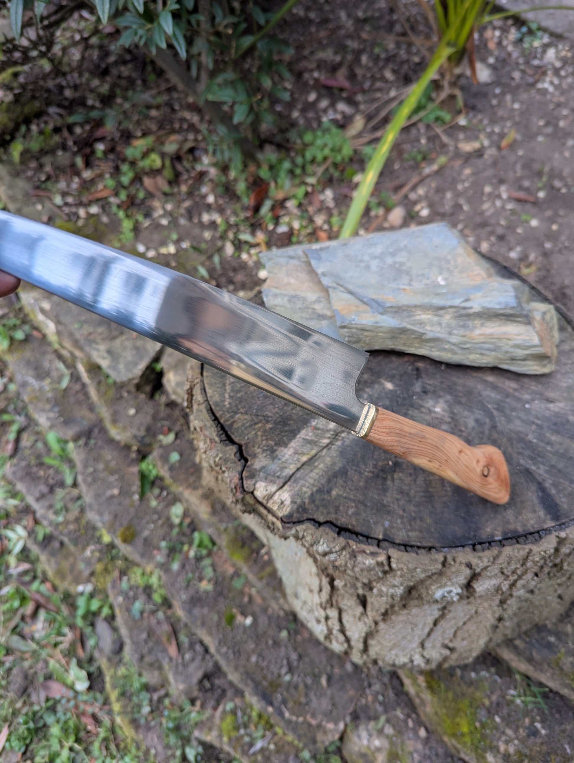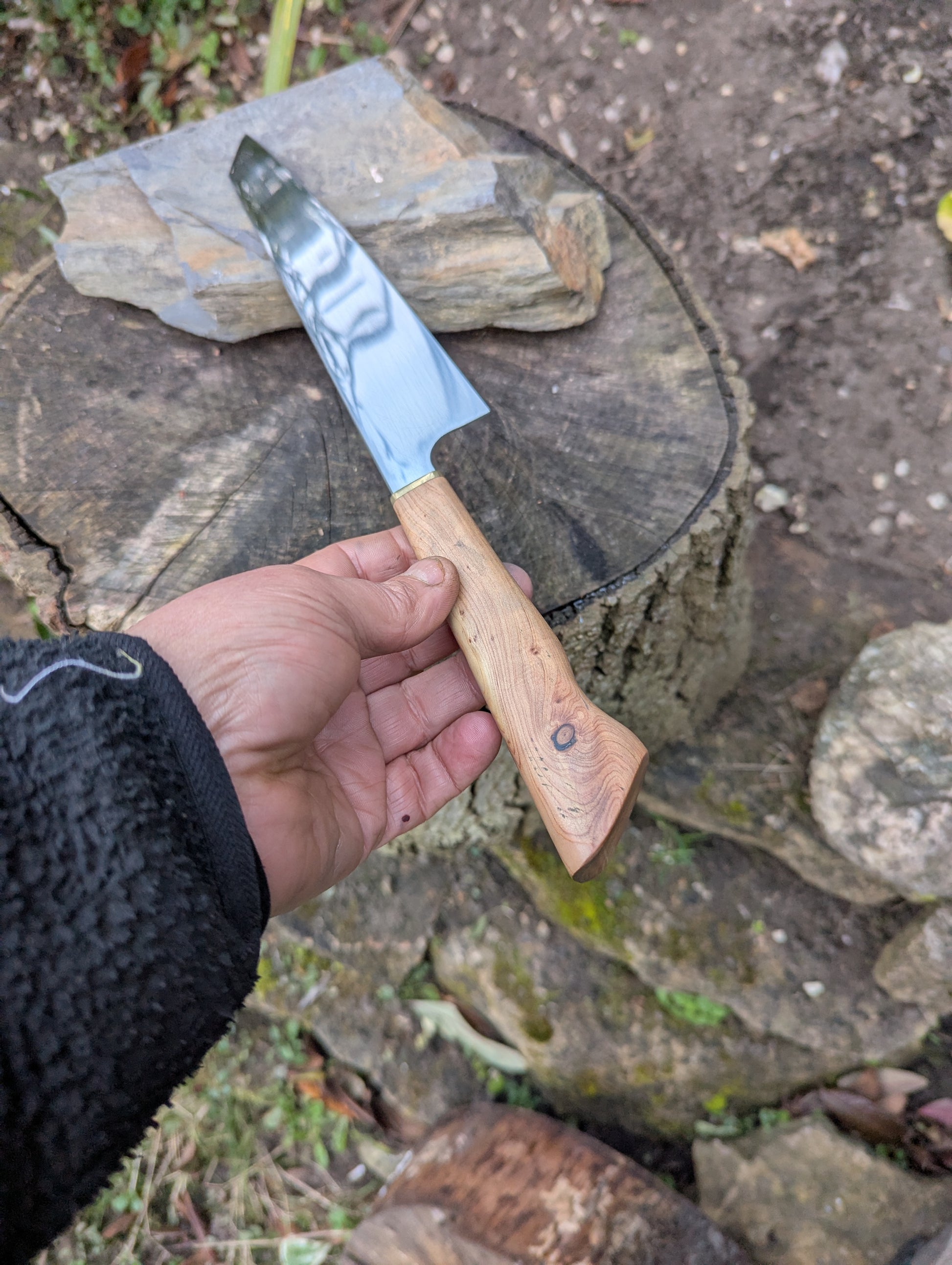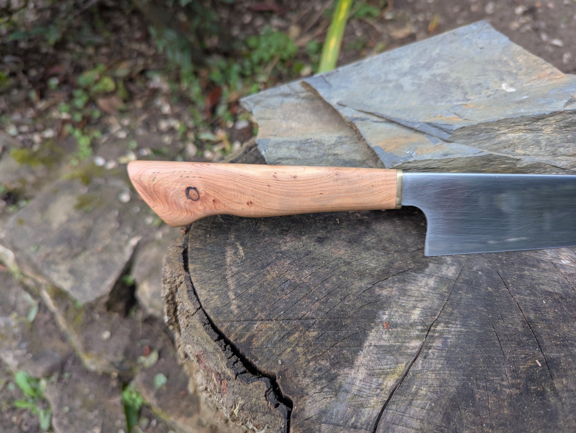 Handle: Fine and tapered Japanese style construction with Nickel silver bolster. Beautiful Cade/Juniper wood from the south of France and it smells amazing too.