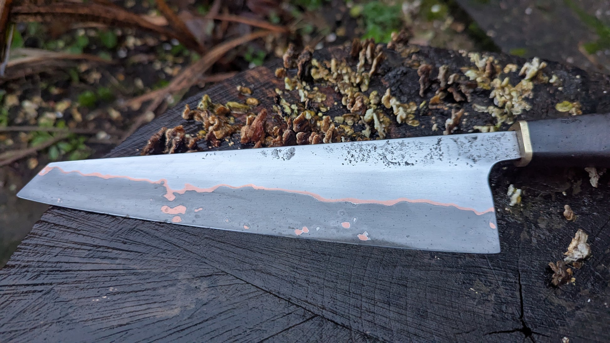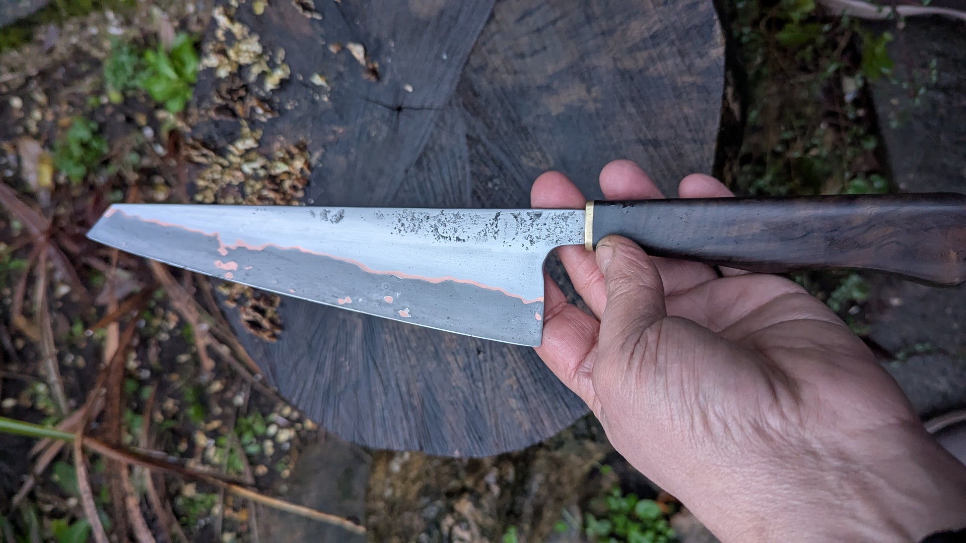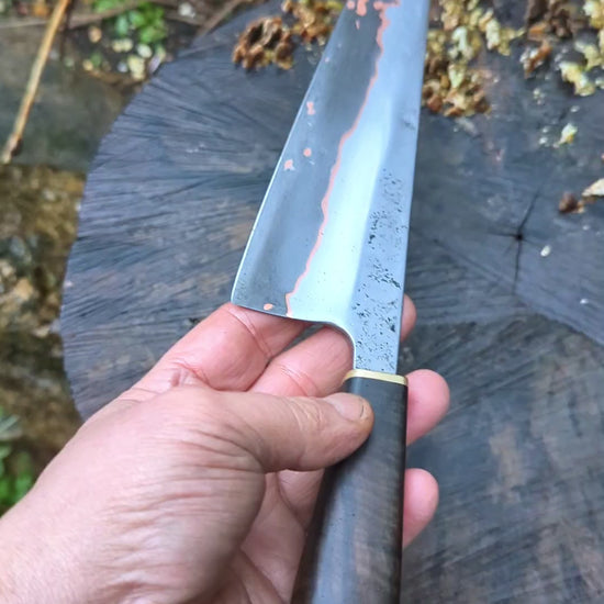 I forged this 5mm Takefu Cu-Mai : DPS V-Toku2 Core Stainless Steel Clad San Mai with a hand-textured finish. The copper within the san-mai is exposed giving a redish tansition between the carbon core and the stainless clading. The hollow grind enhances food release and cutting performance. Both steels have been given a forced patina to start the aging process and help you develop your own unique patina over time.