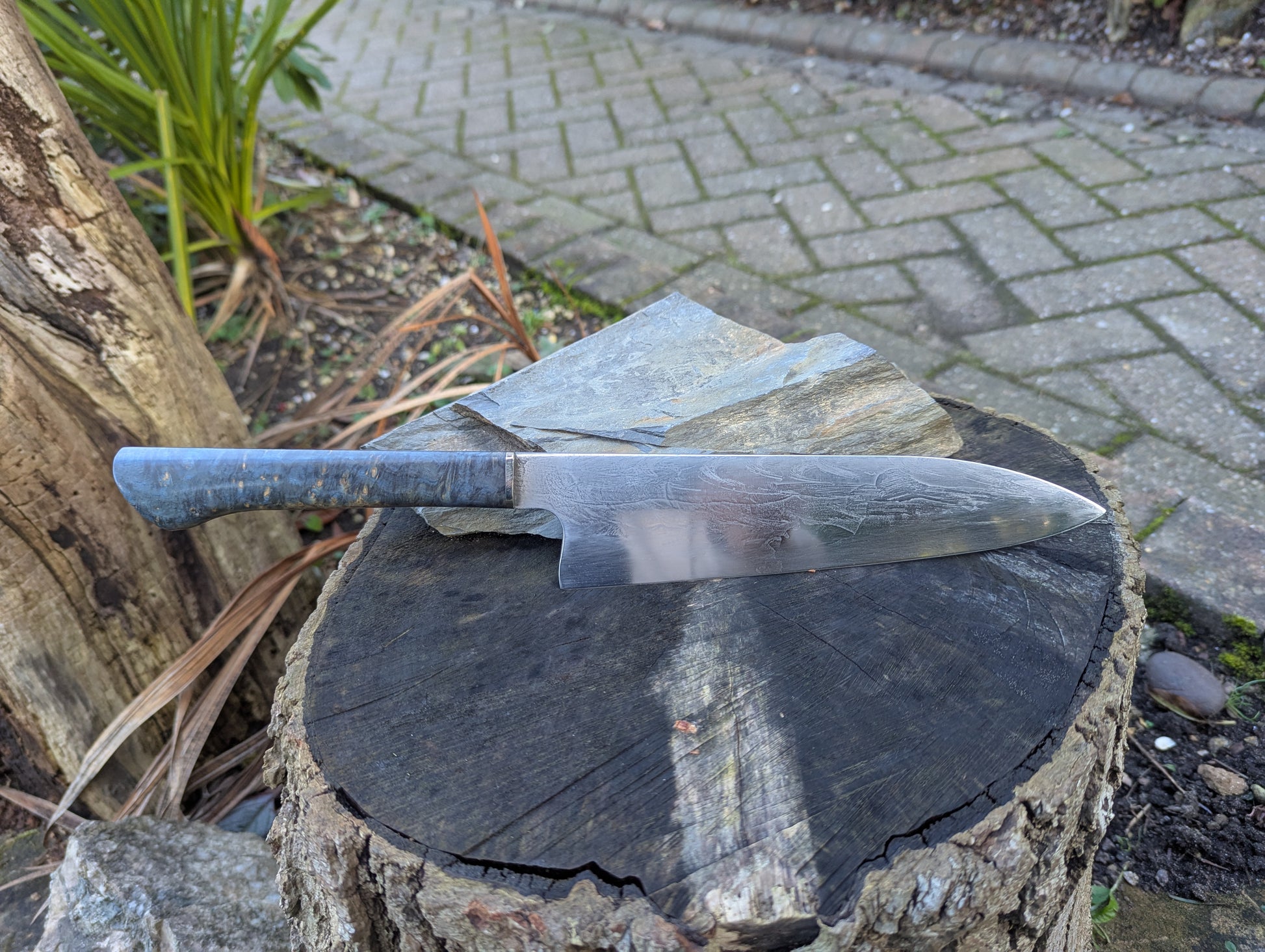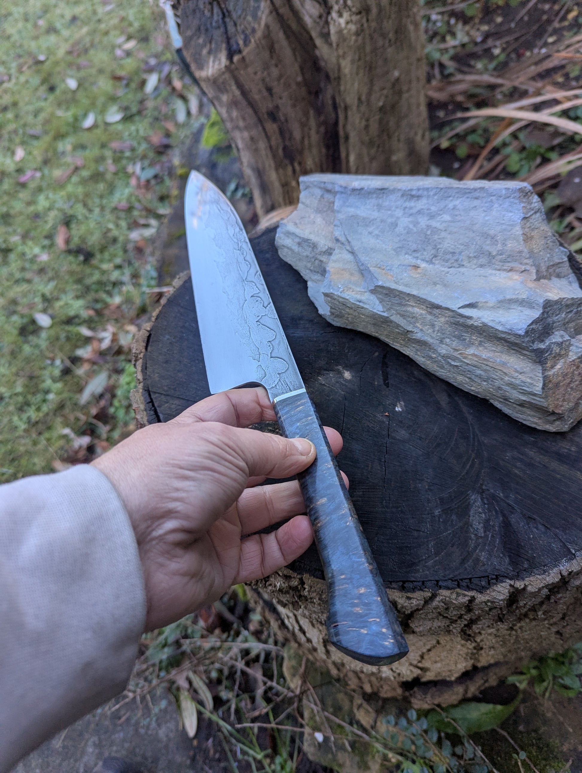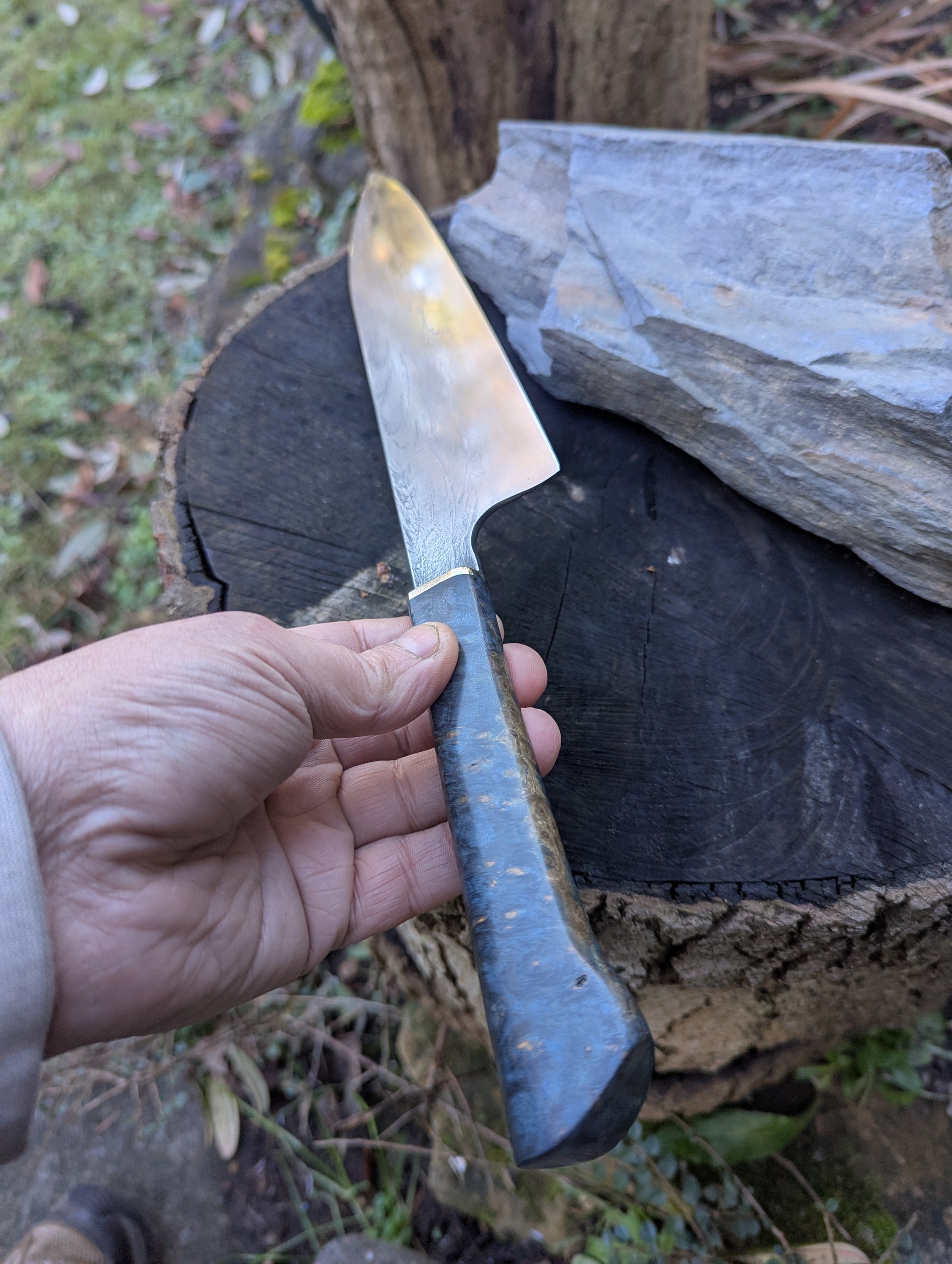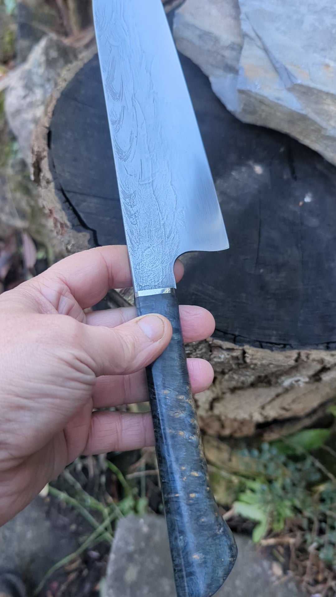 Hand made 8" ApexUltra carbon steel. Amboyna burl handle