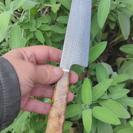 Hand made 8"Stainless Damascus - Damasteel® DS93X - Munin . Amboyna Burl handle