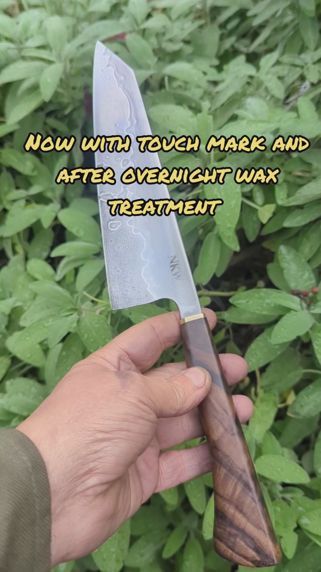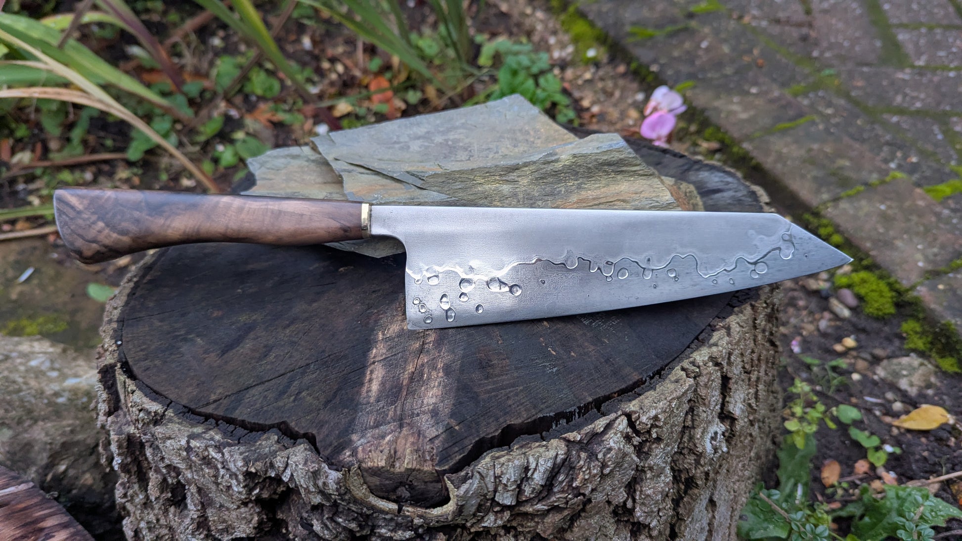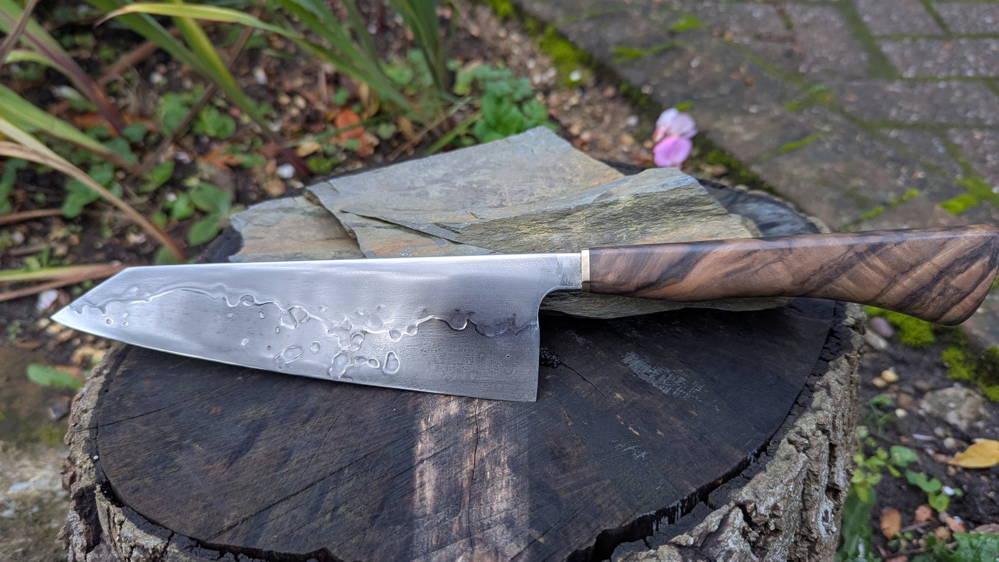 I forged this 3.5 mm Takefu Super Blue stainless-clad San Mai with a hand-textured finish. The convex grind transitions into an S-grind, giving the blade a lively feel with excellent food release. The subtle hollow reduces drag and helps food fall away cleanly, while the convex shoulder keeps the knife stiff and strong through heavier cuts.