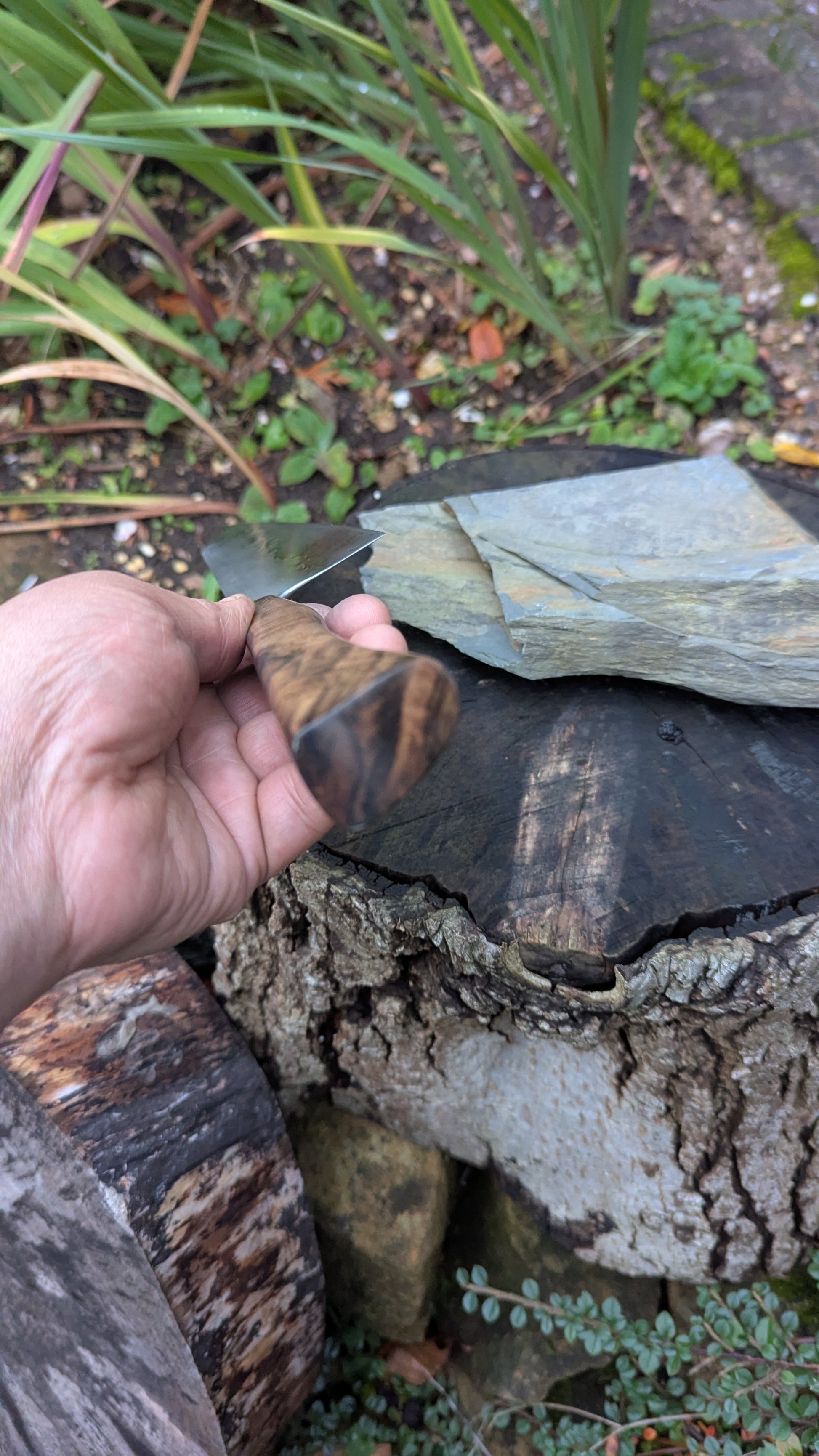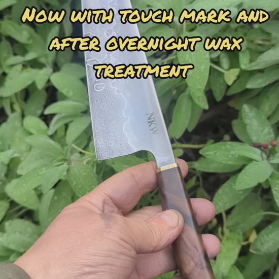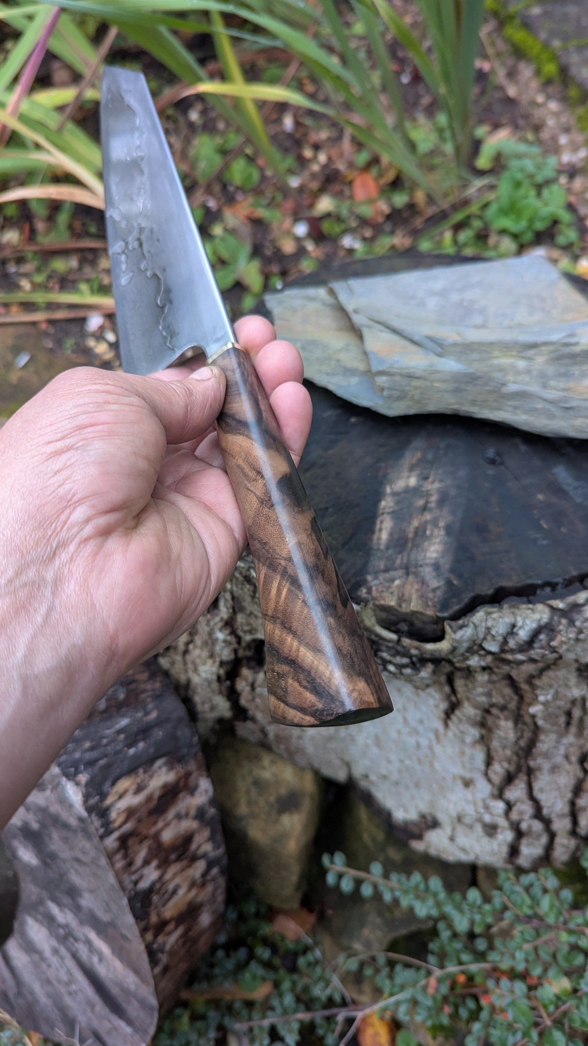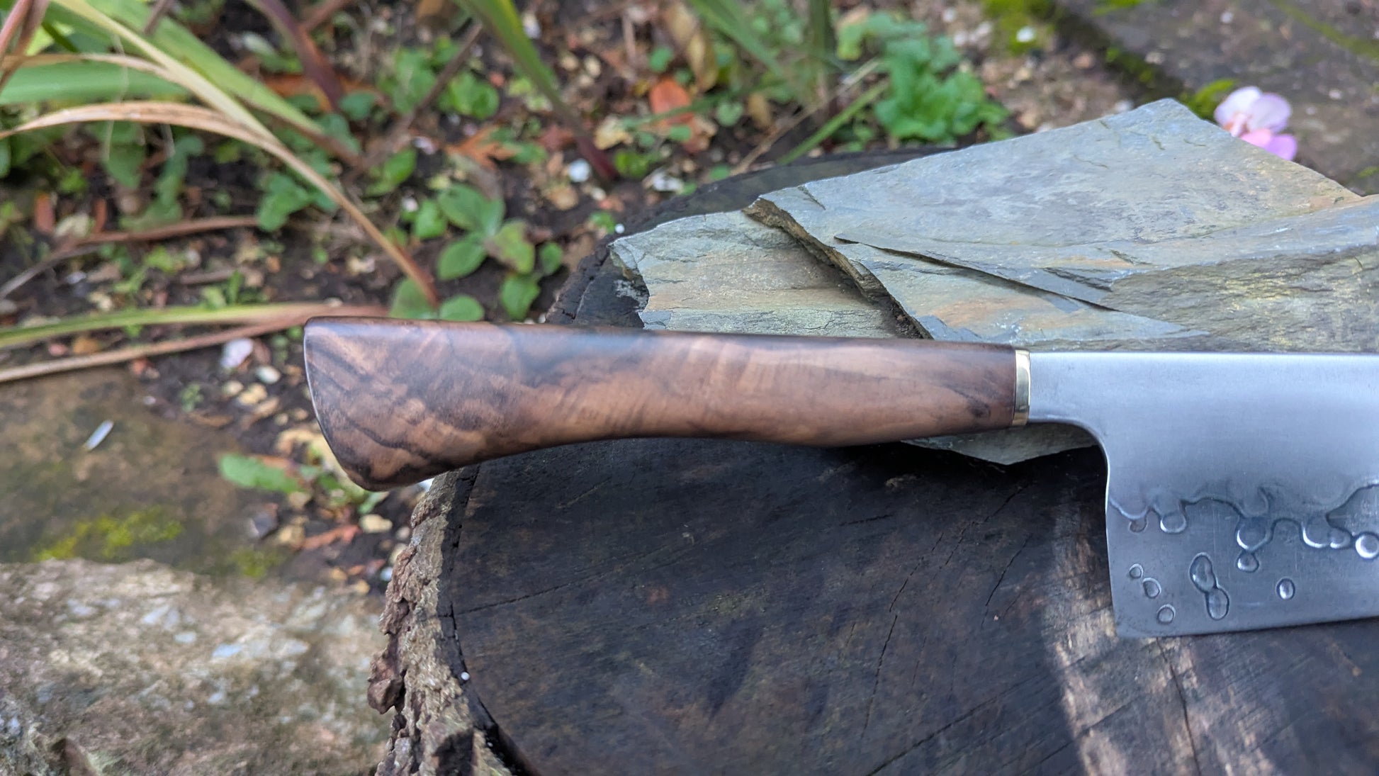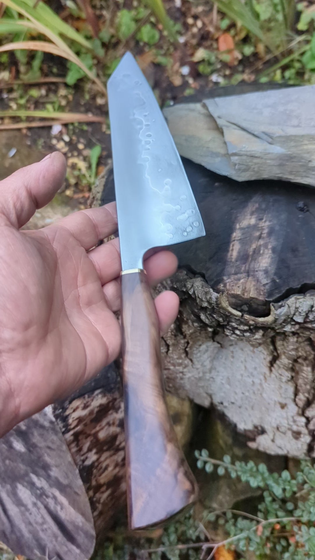 This 8″ knife is made with Takefu super blue stainless clad San Mai and a stunning piece of highly figured walnut for the handle.
