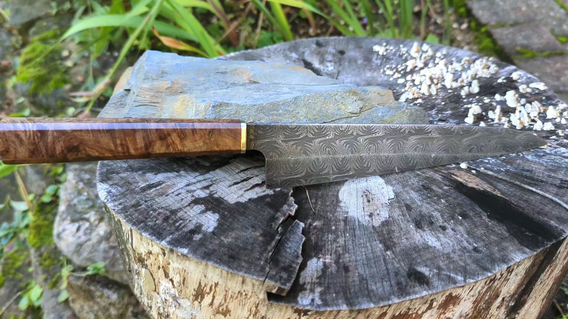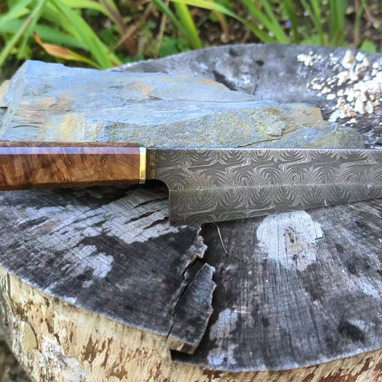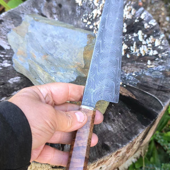 Handmade 8" Carbon Steel Damascus, Wood Burl