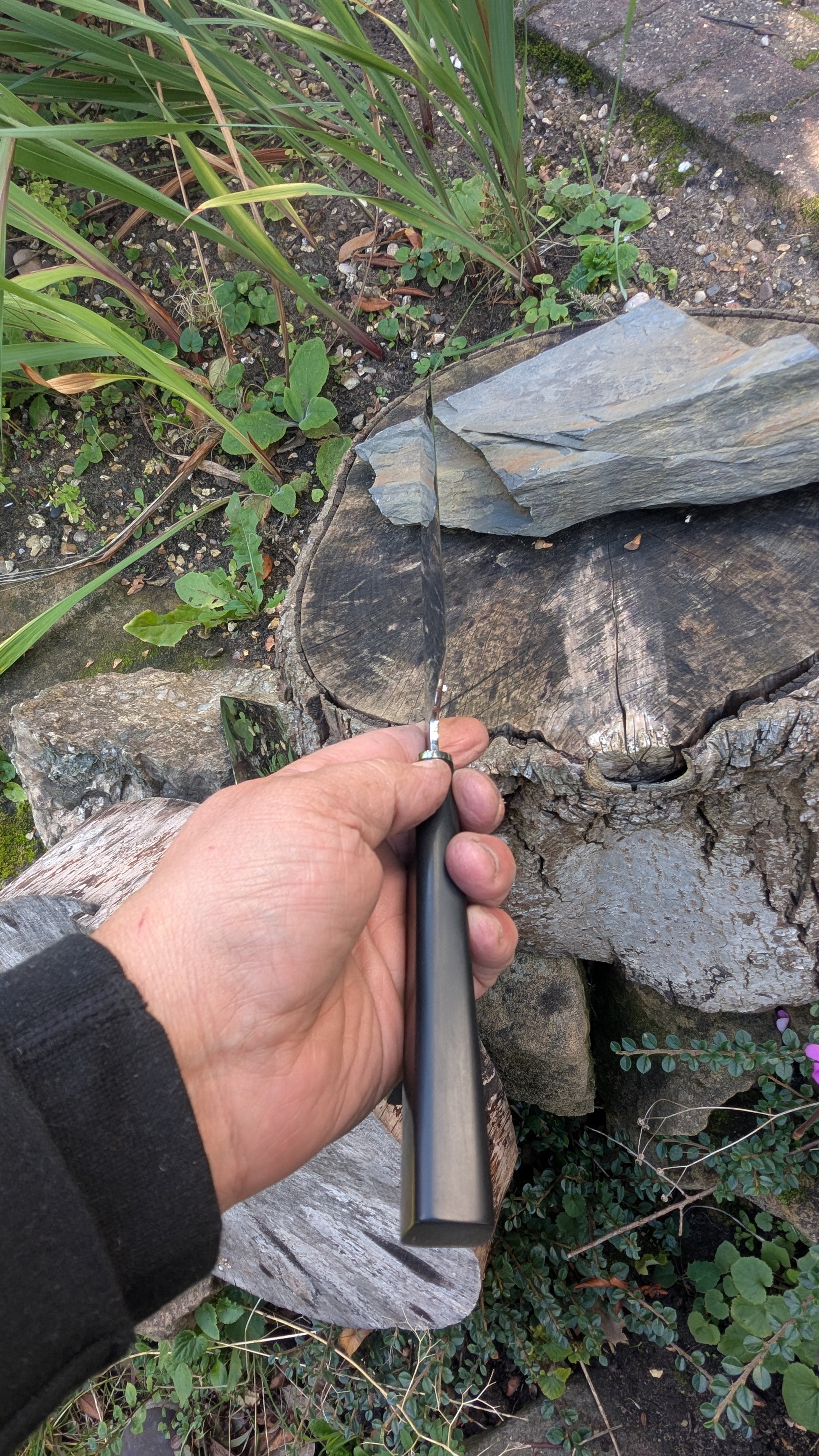 Handle: Fine and tapered Japanese style construction. Richelite Black diamond 100% recycled (post-consumer) Paper Micarta. Video Here