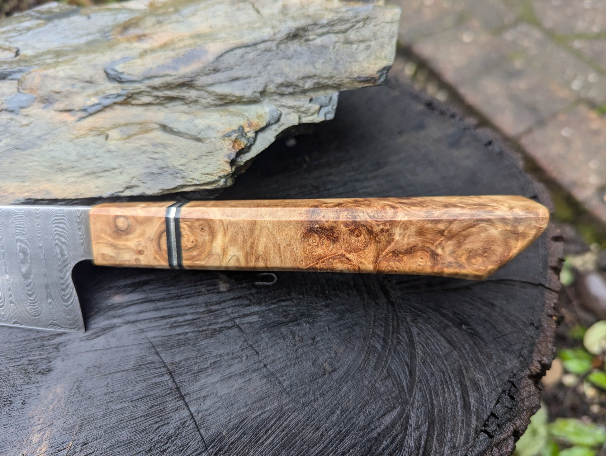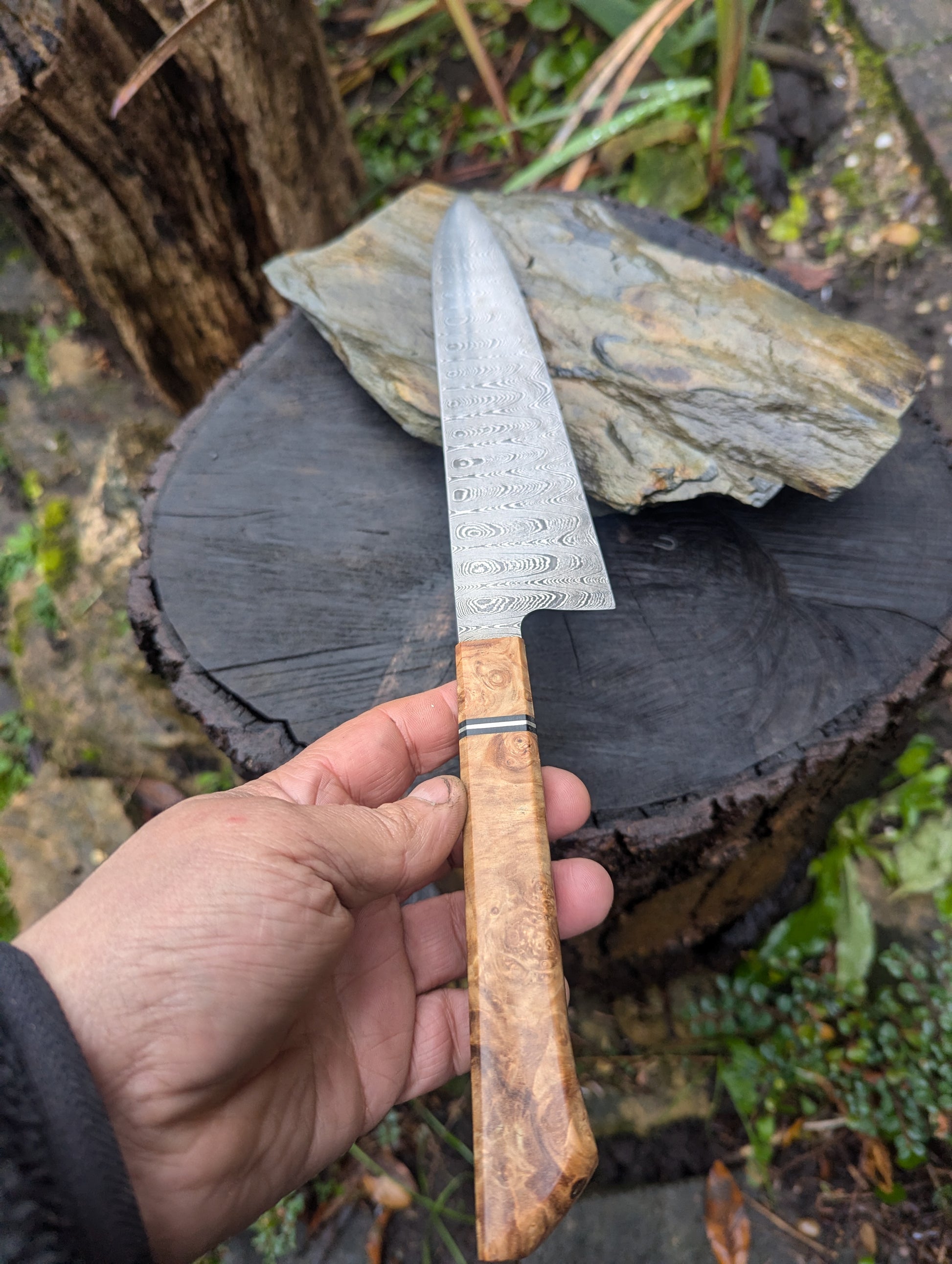 Handle: Japanese style construction. Stabilised Chesnut burl, black G10 and Nickel spacers