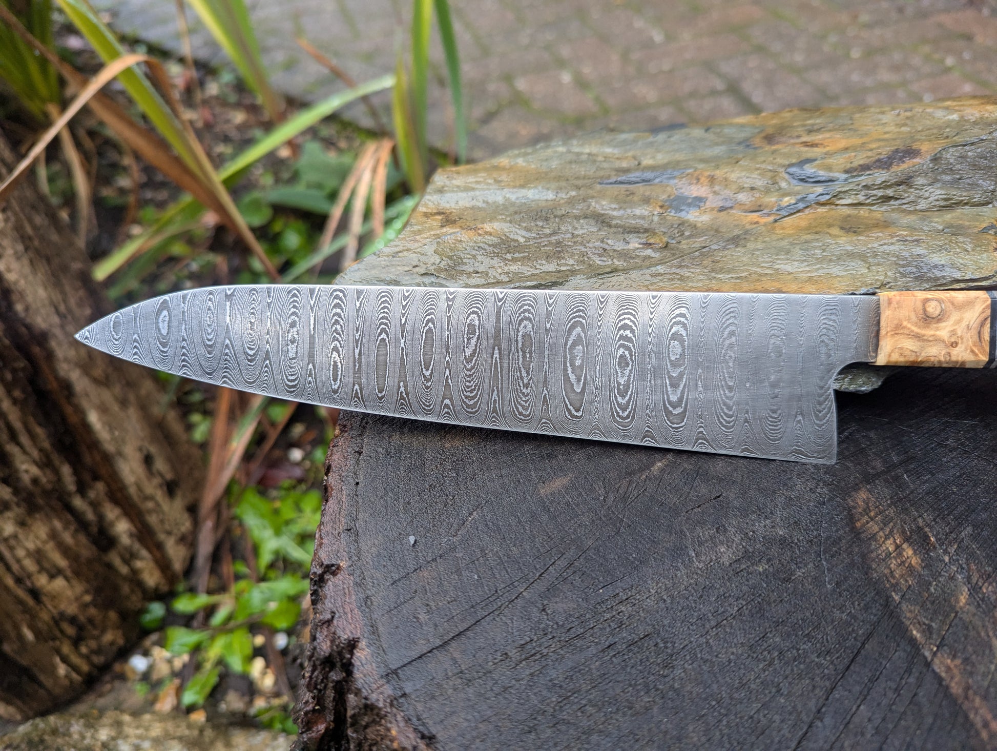 Steel: Hand-forged (in whiltshire) ladder Damascus( 1095 +15N20) , convex grind for better food release.
