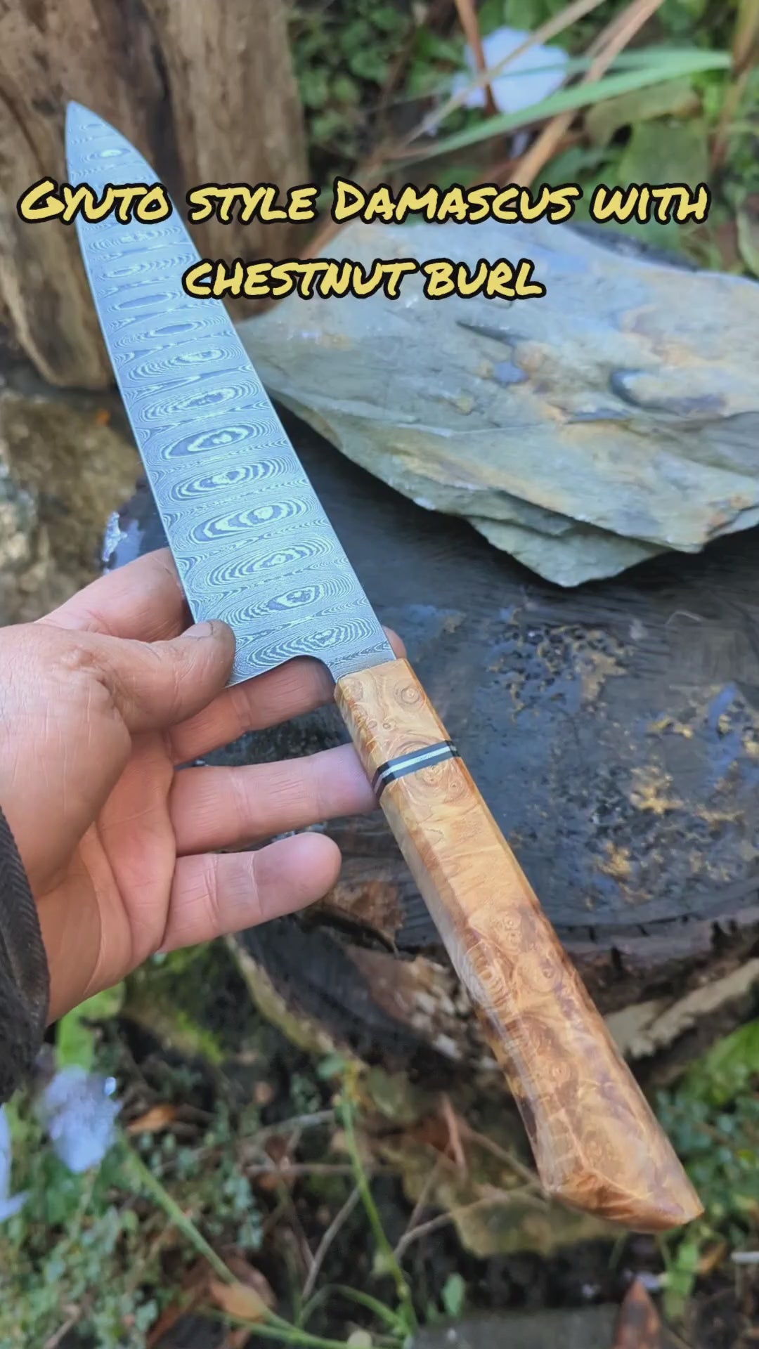 Handmade 8" Gyuto, Hand-forged ladder Damascus. chestnut burl with black G10 and nickel handle