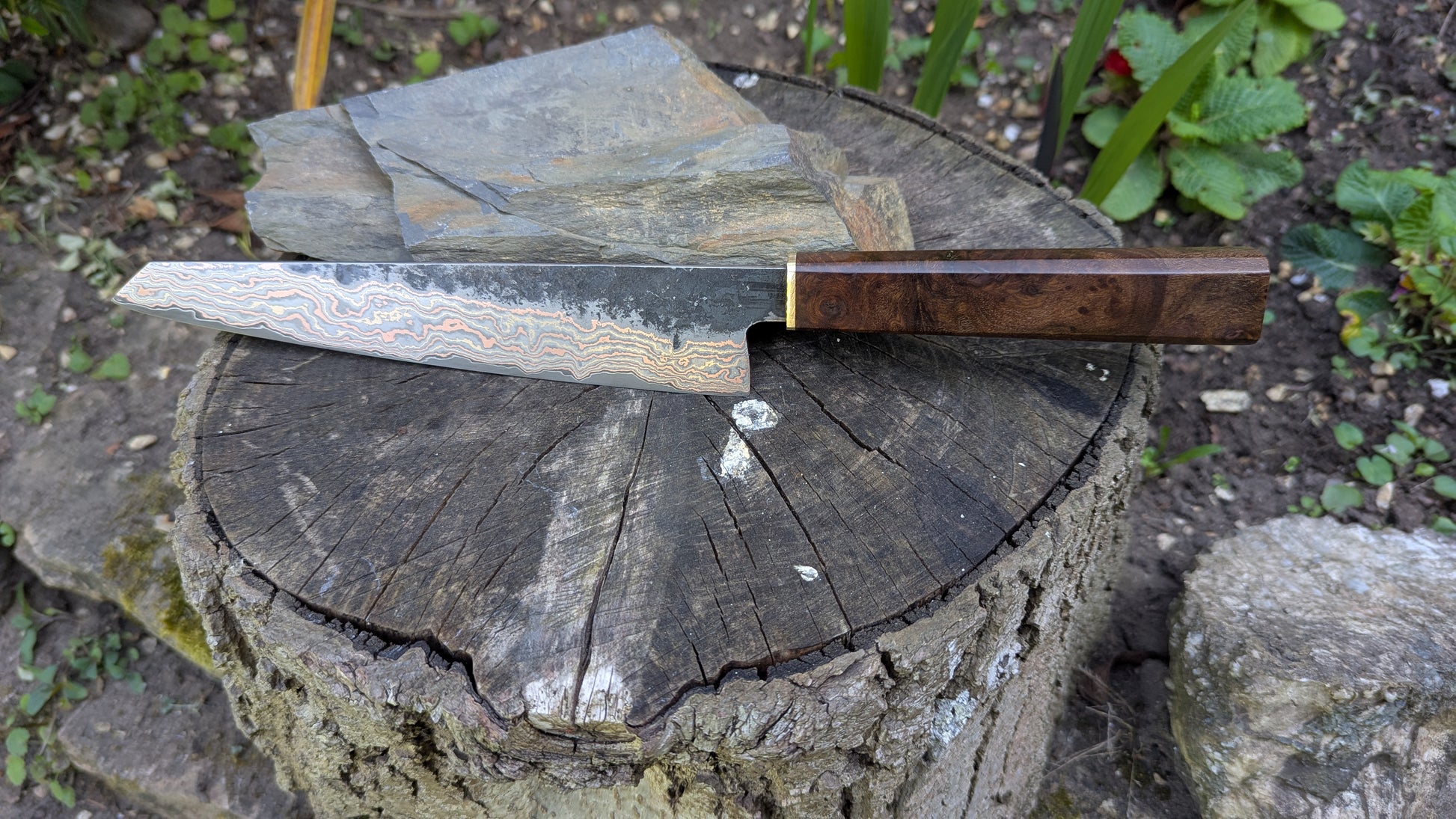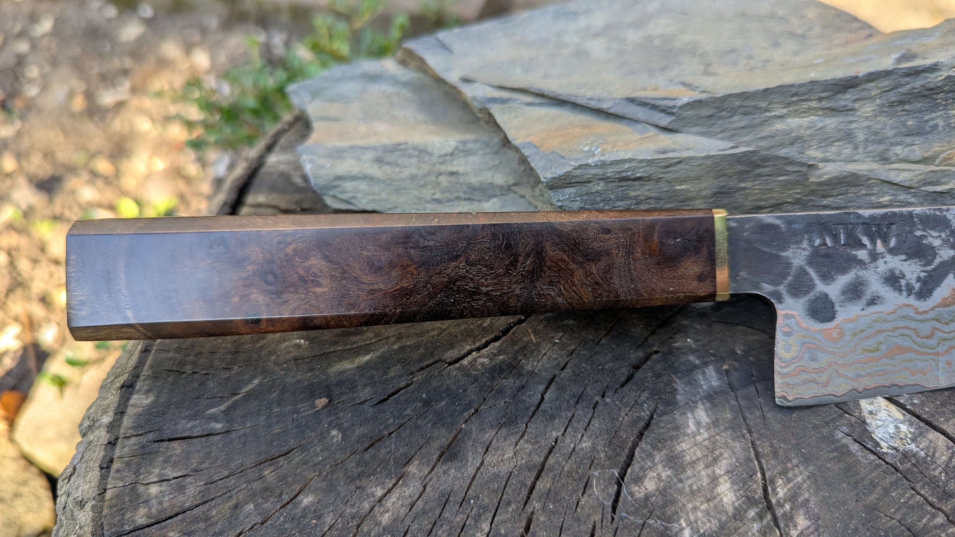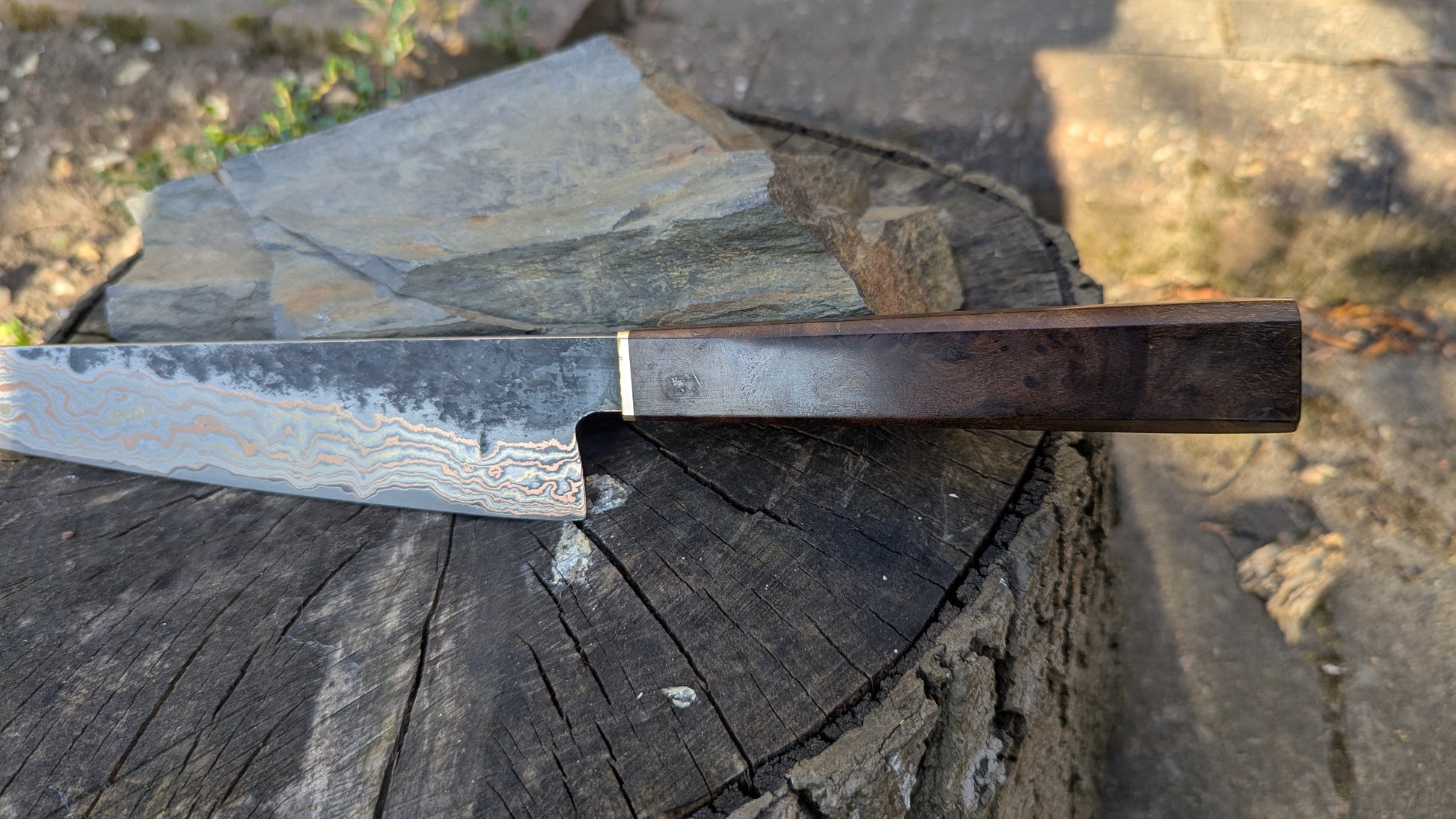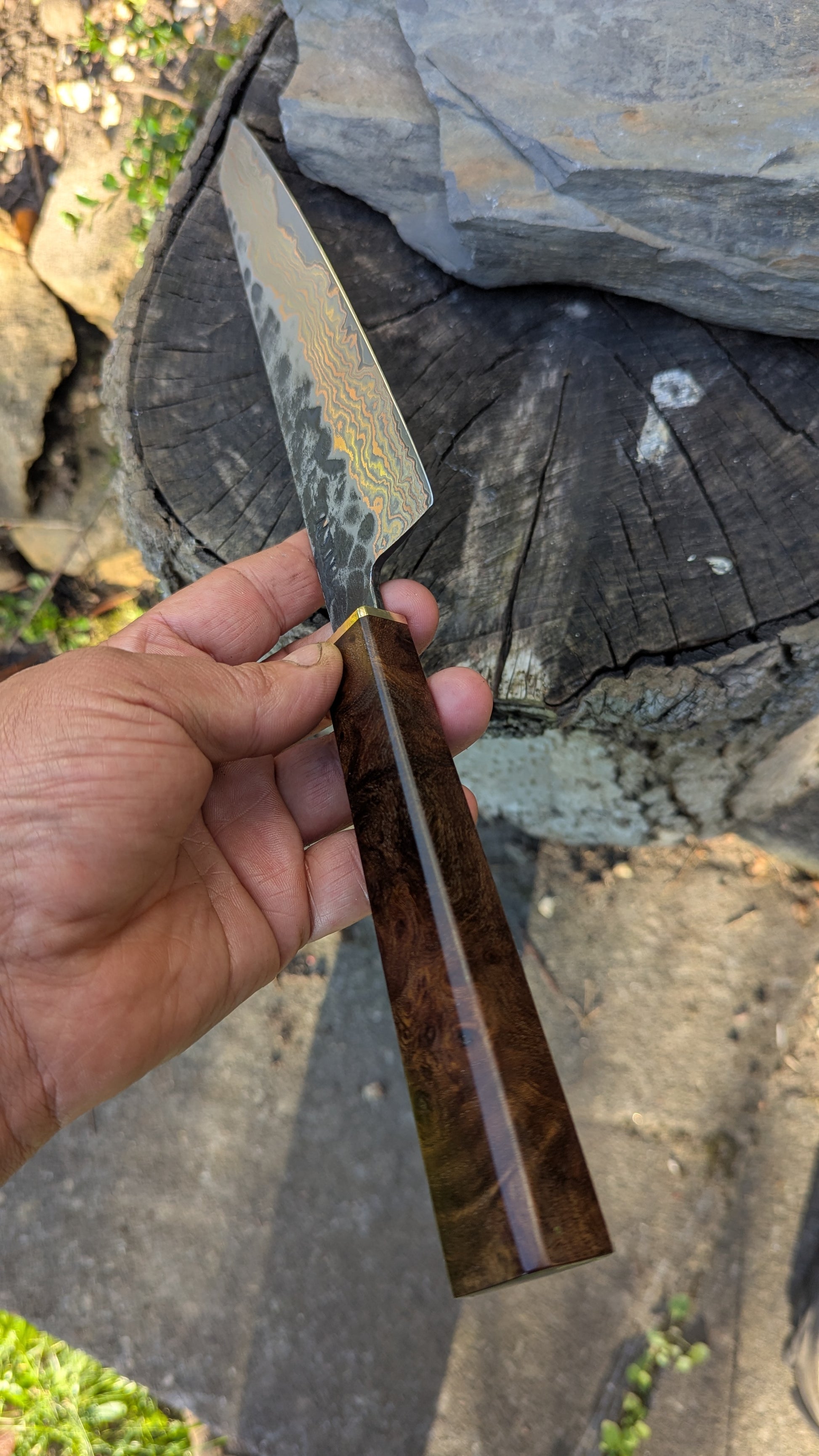 Hand-forged Yu-Shoku VG10w core Mokume clad (rainbow damascus). Burr Elm with brass bolster handle