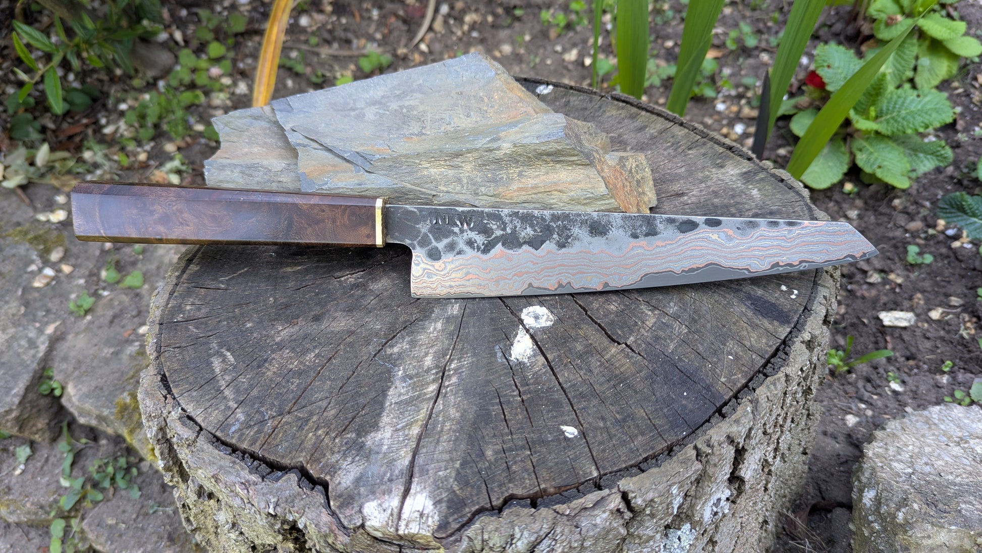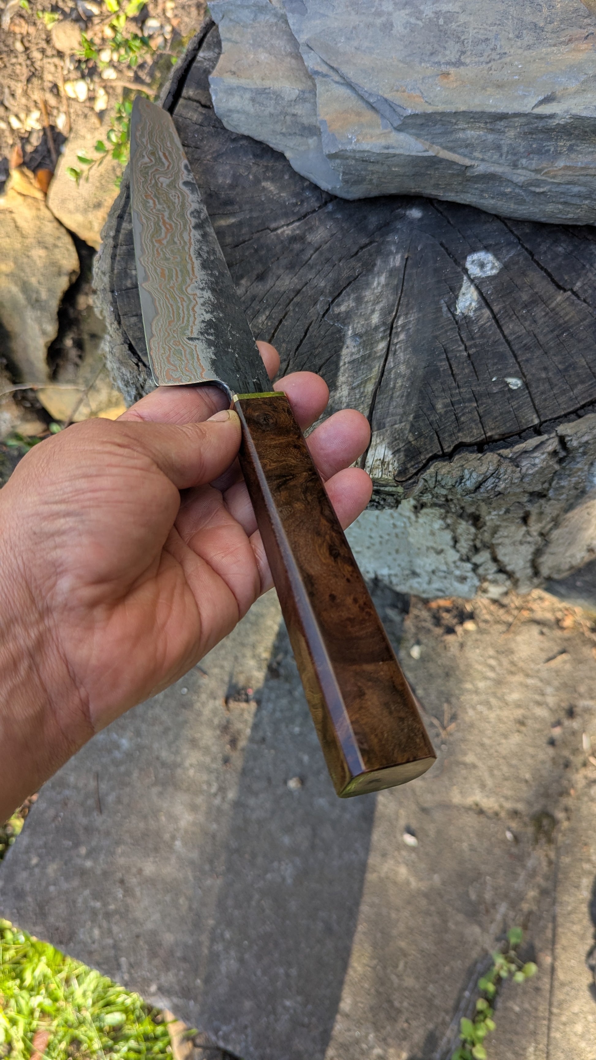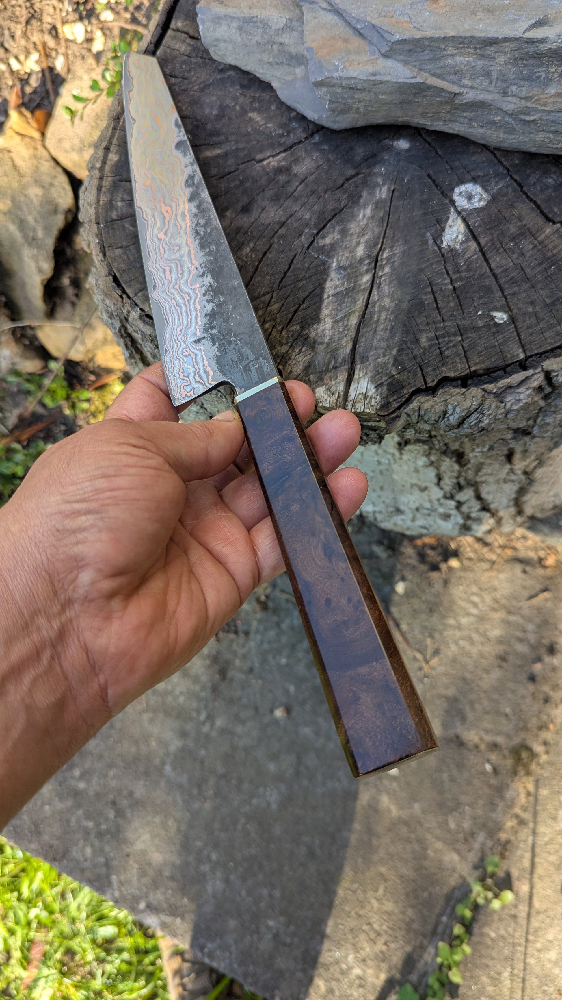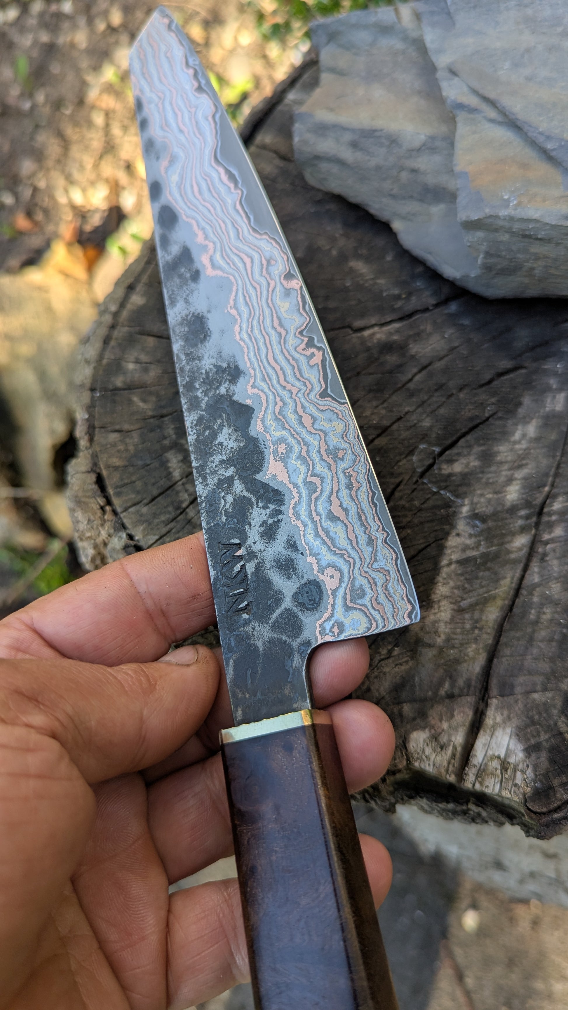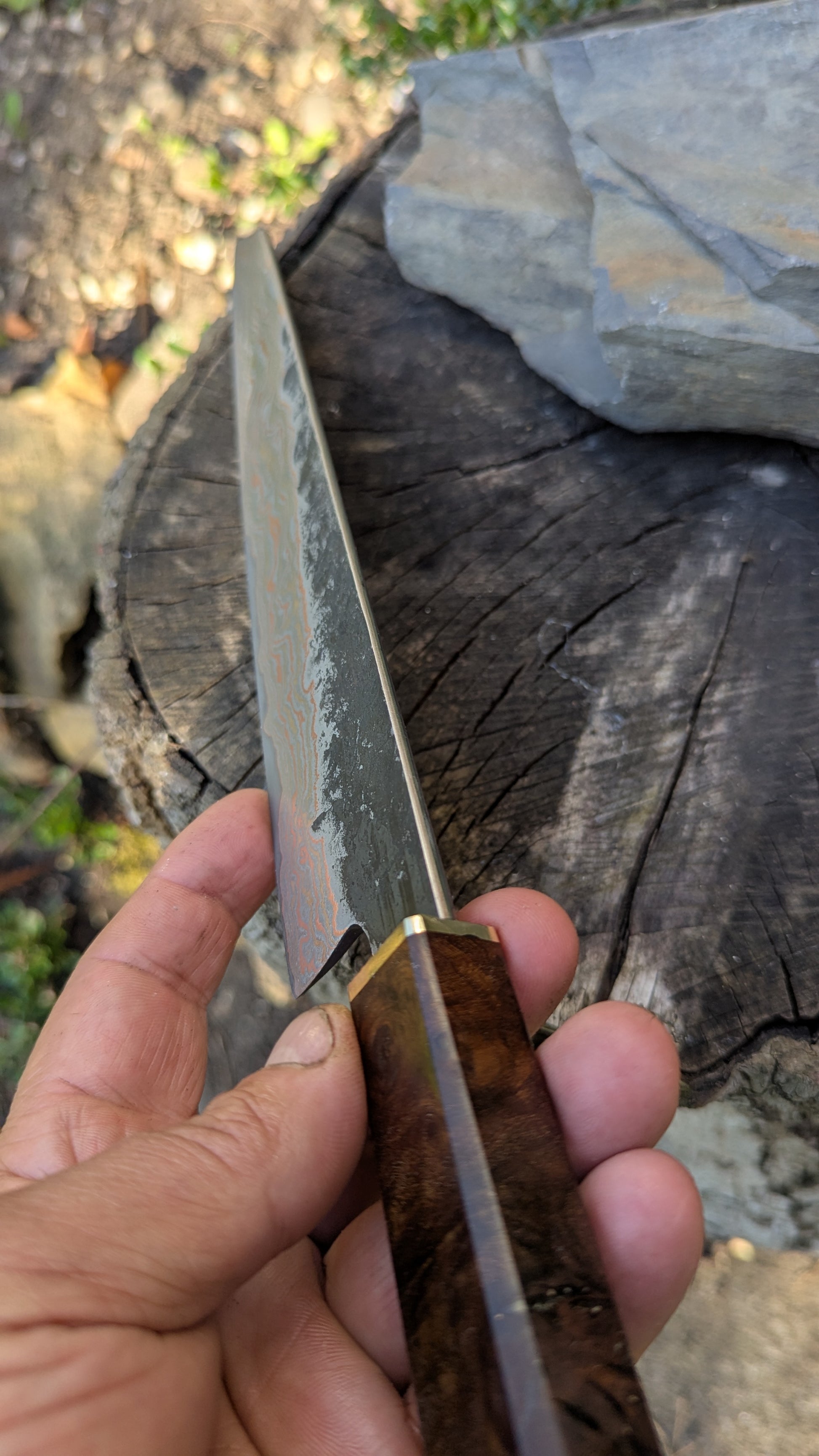 Hand-forged Yu-Shoku VG10w core Mokume clad (rainbow damascus). Burr Elm with brass bolster handle