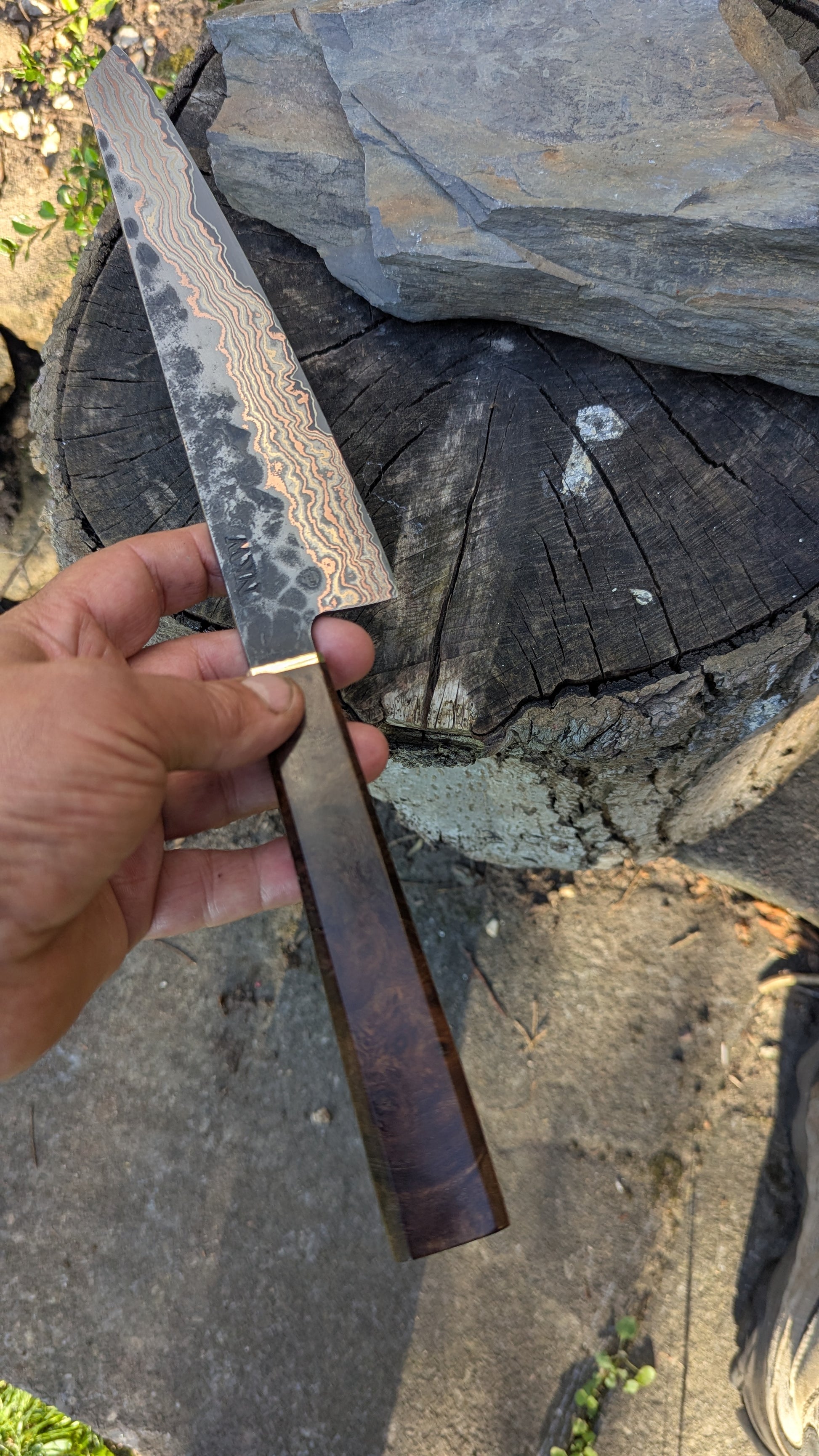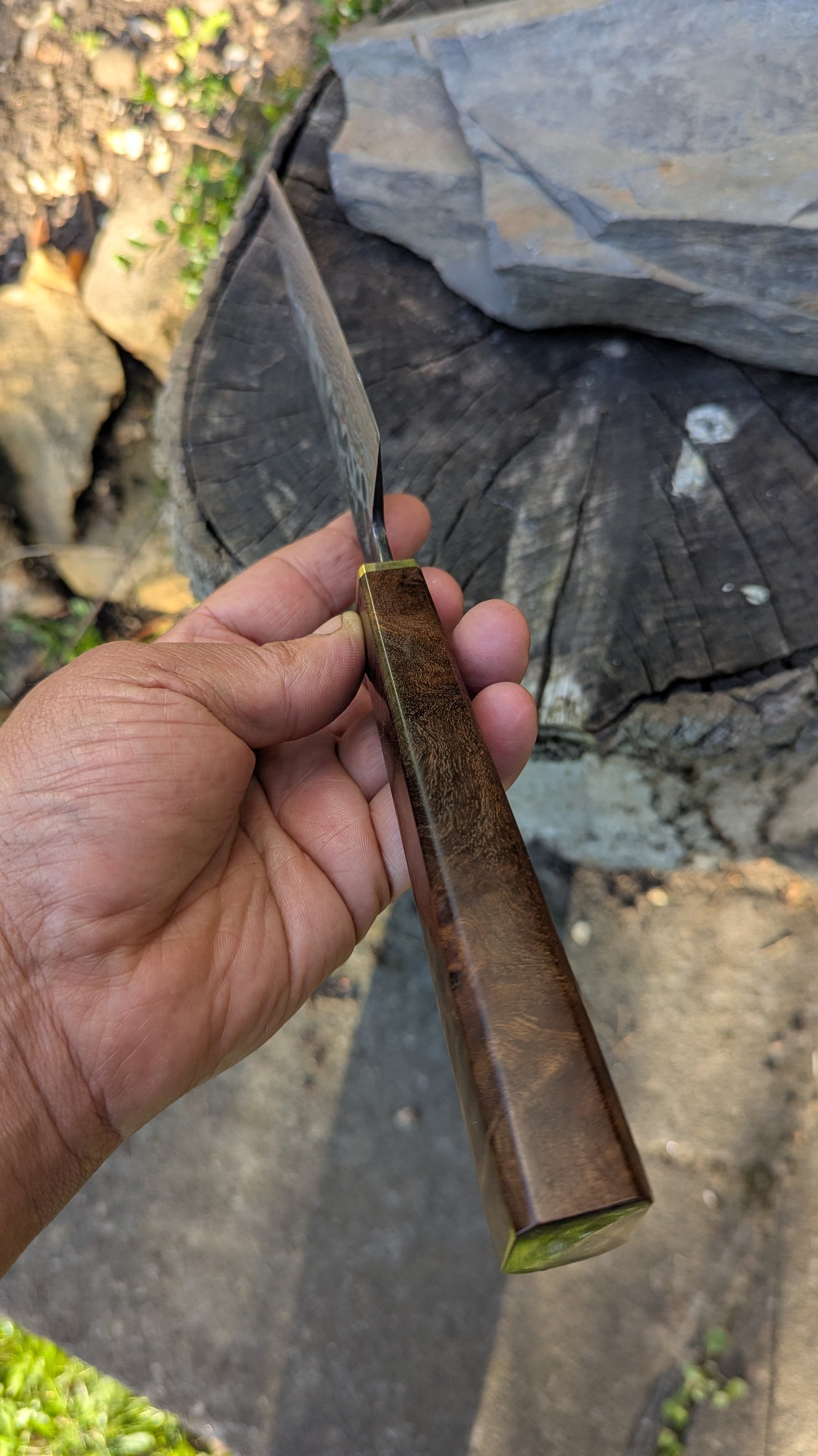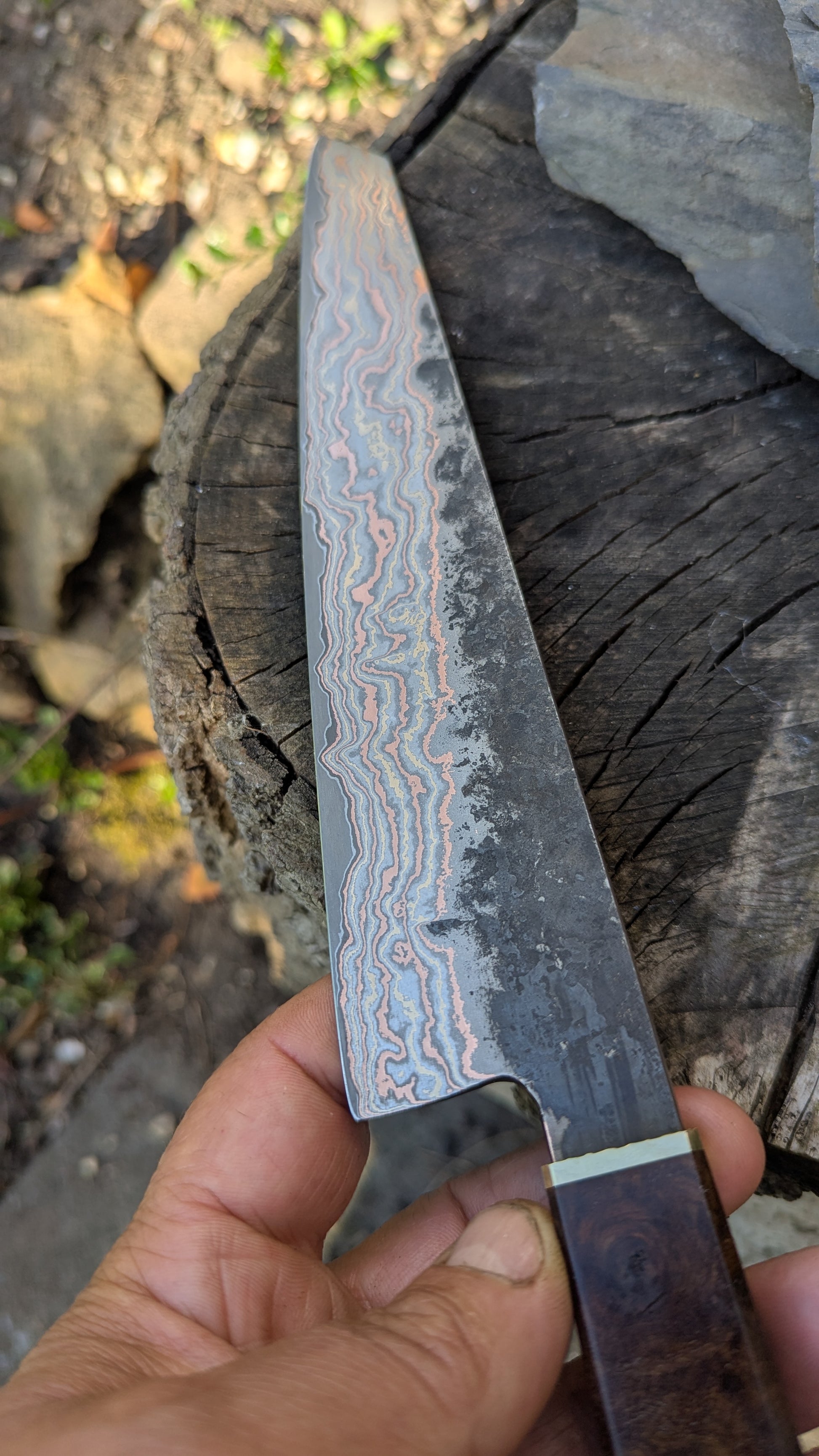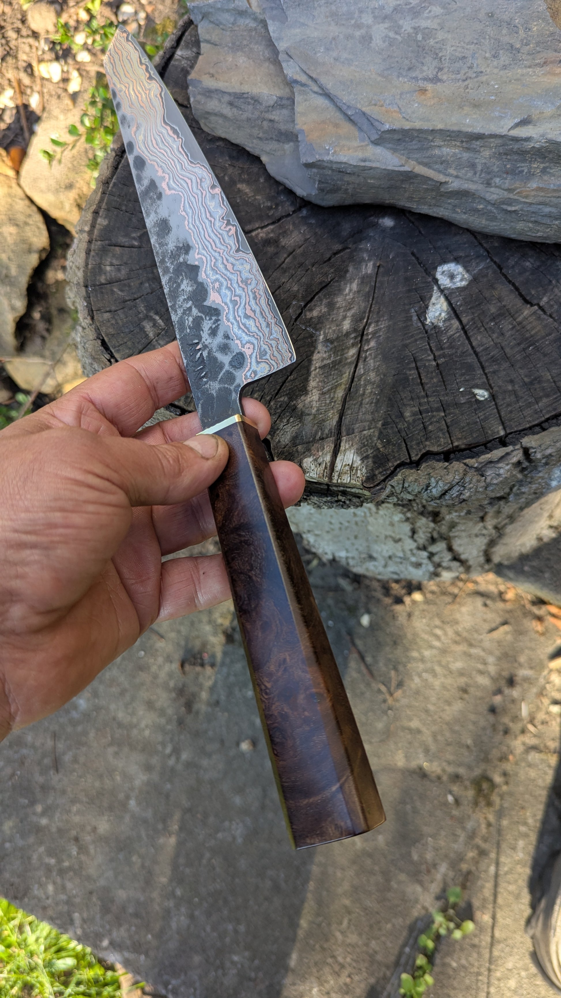 Hand-forged Yu-Shoku VG10w core Mokume clad (rainbow damascus). Burr Elm with brass bolster handle