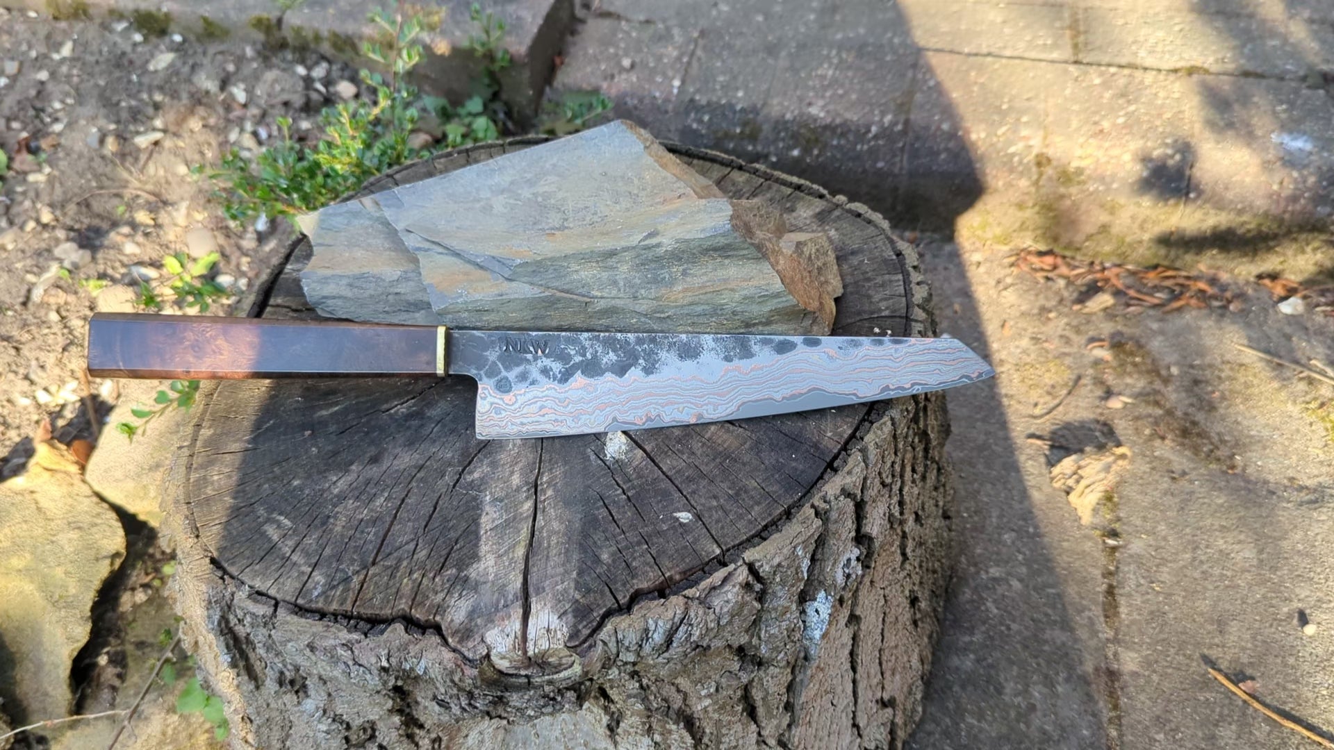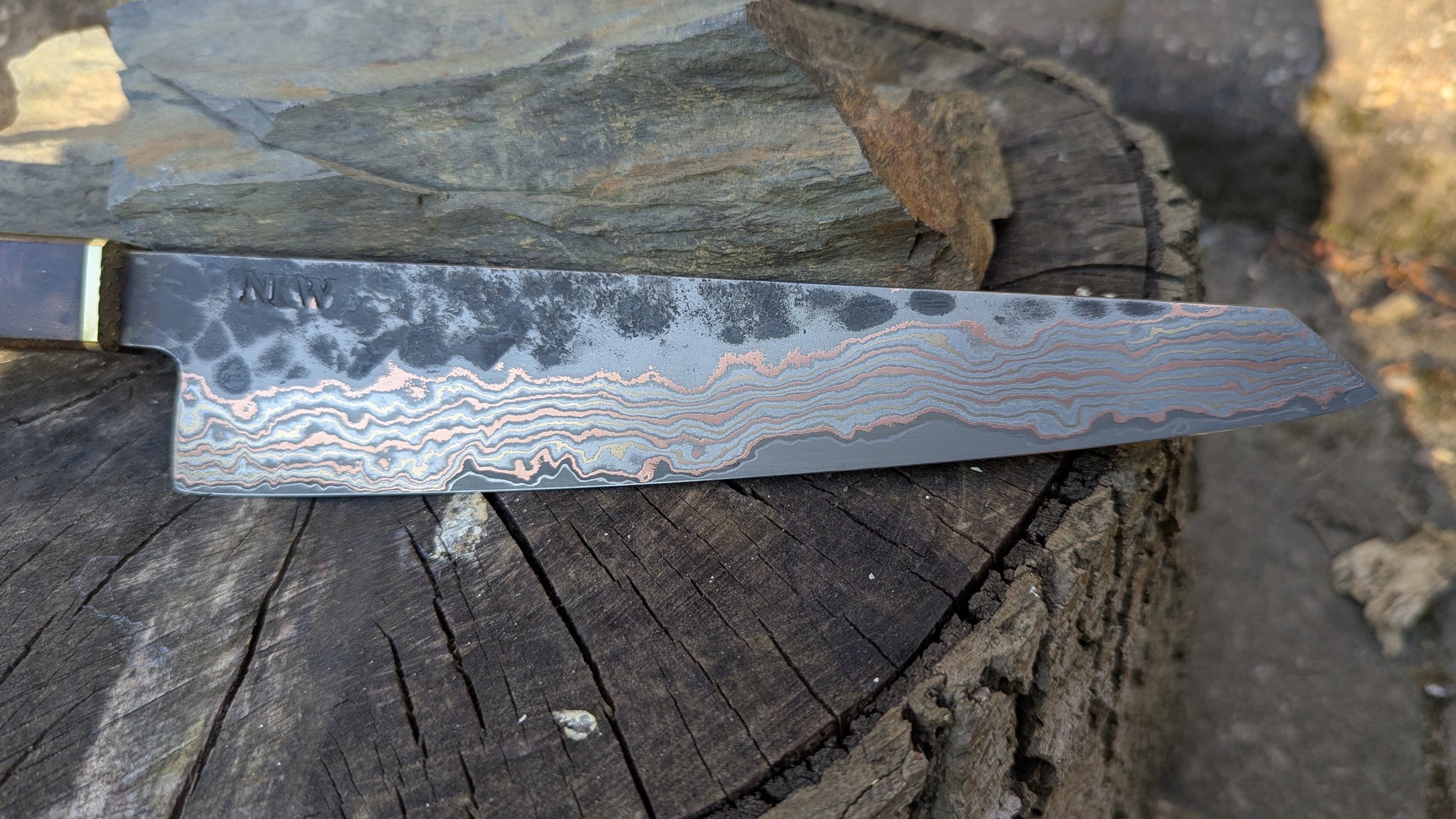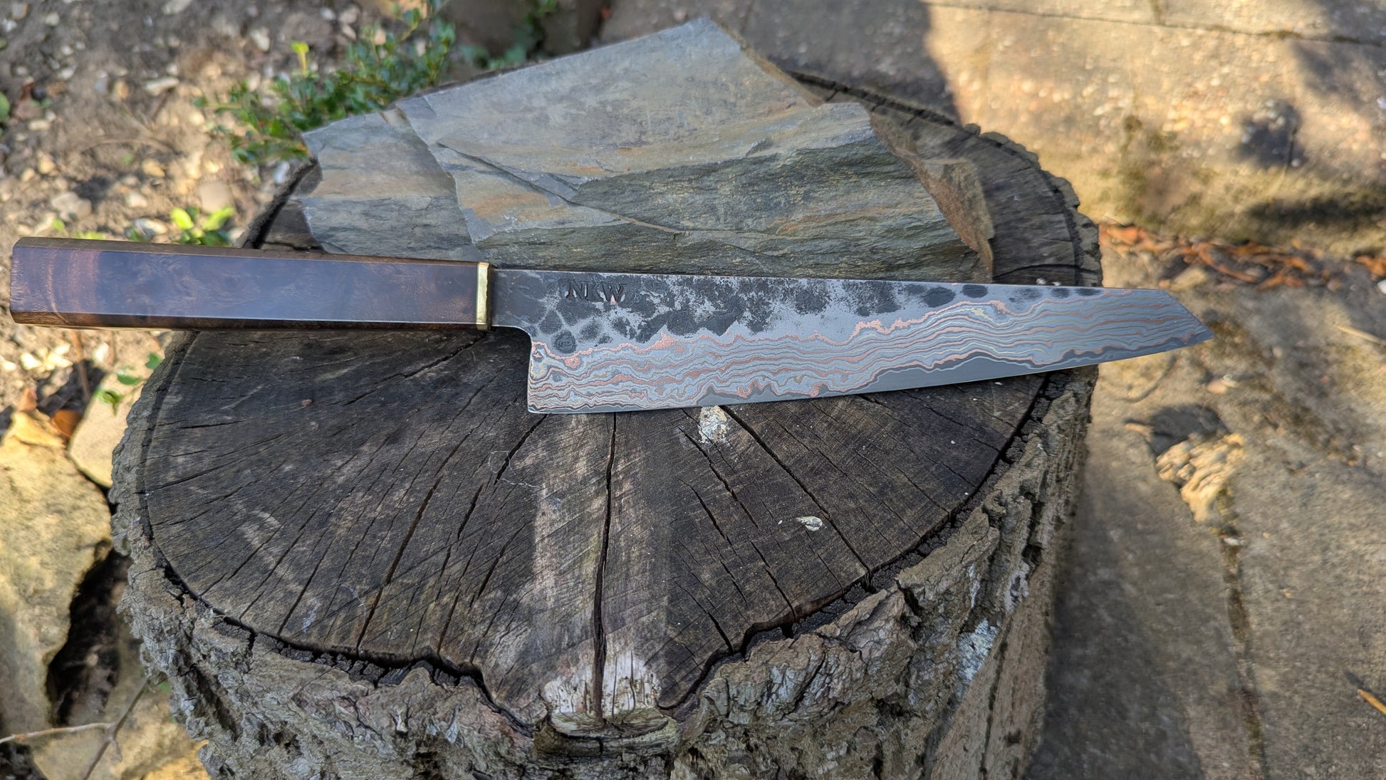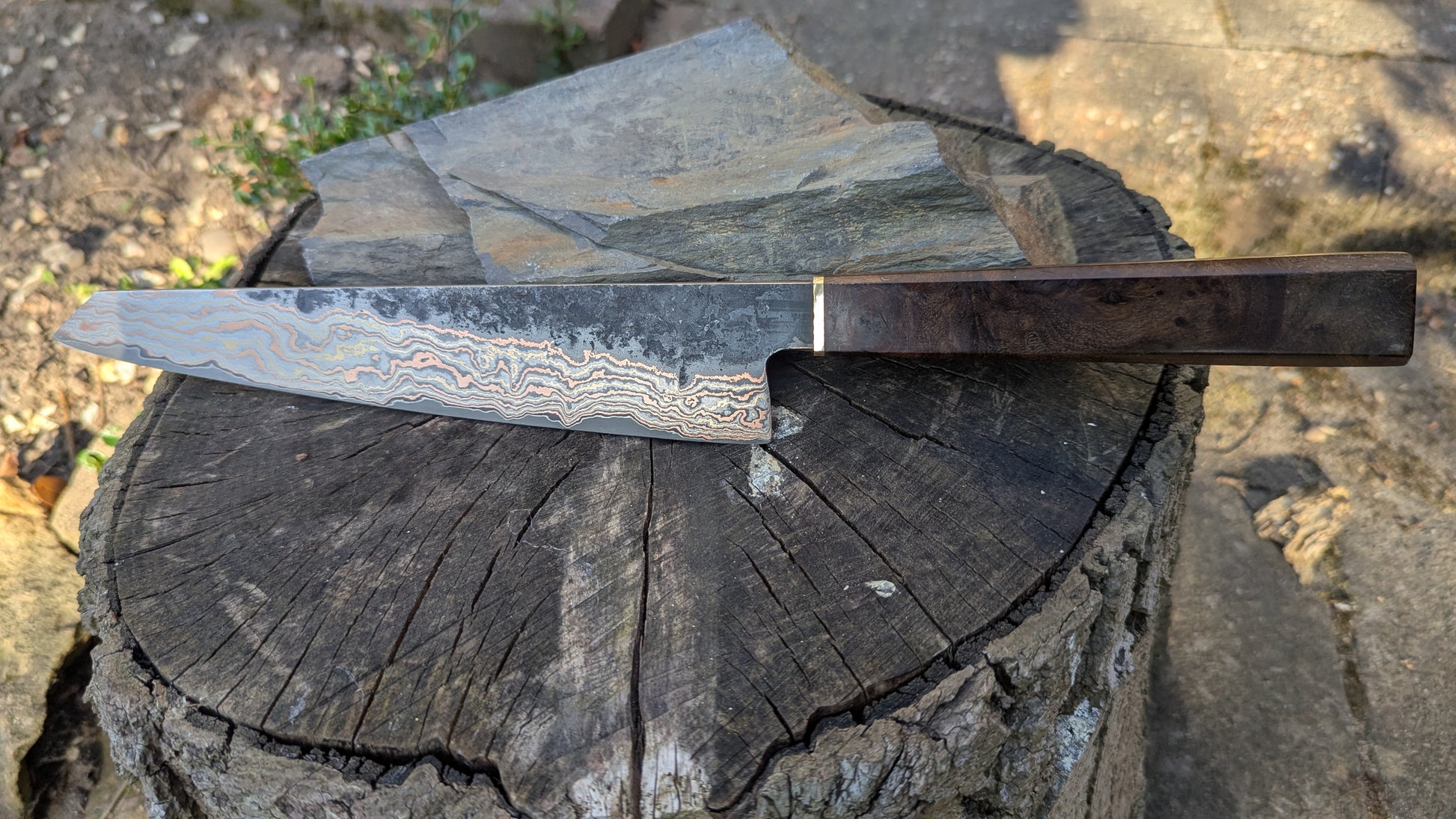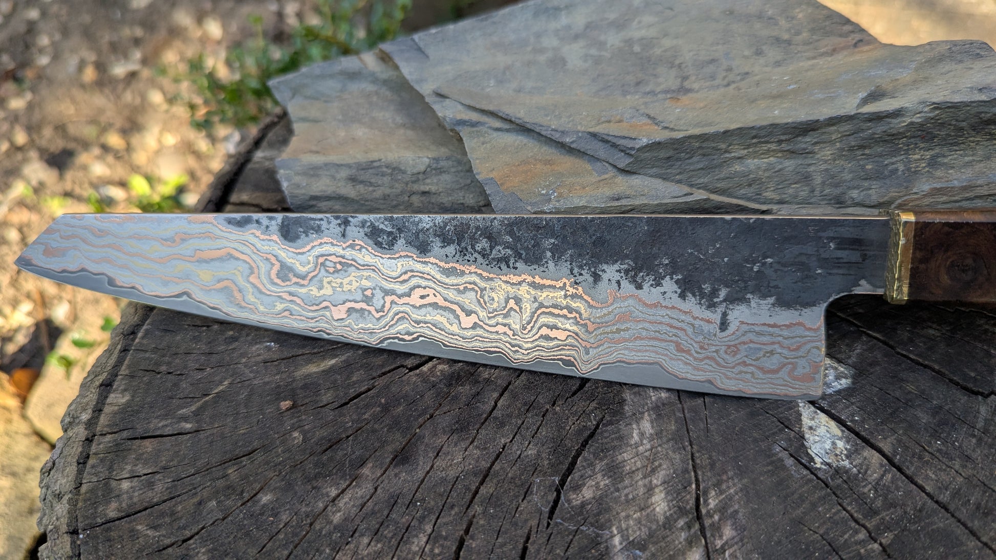 Hand-forged Yu-Shoku VG10w core Mokume clad (rainbow damascus). Burr Elm with brass bolster handle
