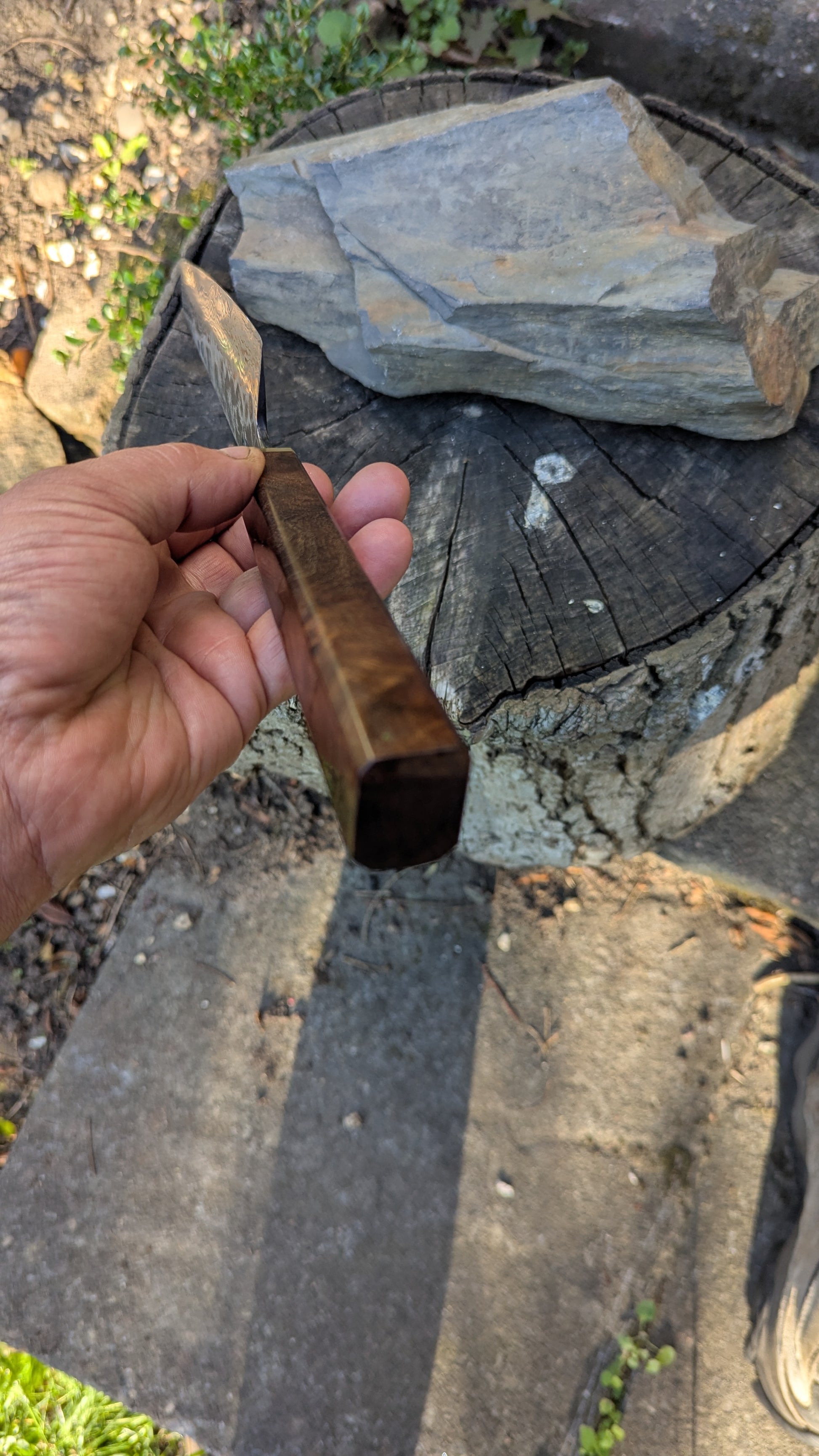 This 8″ knife is made from Burr Elm and very fine Japanese steel. It is designed to be good for push cut and rocking chopping action.